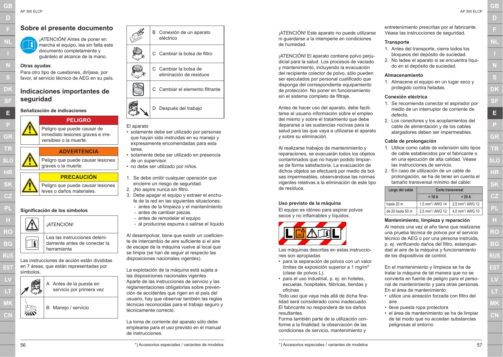 Sobre el presente documento ¡ATENCIÓN! Antes de poner en marcha el equipo, lea sin falta este documento completamente y guárdelo al alcance de la mano. Otras ayudas Para otro tipo de cuestiones, diríjase, por favor, al servicio técnico de AEG en su país. C Cambiar la bolsa de filtro ¡ATENCIÓN! El aparato contiene polvo perjudicial para la salud. Los procesos de vaciado y mantenimiento, incluyendo la evacuación del recipiente colector de polvo, sólo pueden ser ejecutados por personal cualificado que disponga del correspondiente equipamiento de protección. No poner en funcionamiento sin el sistema completo de filtraje. C Cambiar la bolsa de eliminación de residuos Señalización de indicaciones D Después del trabajo PELIGRO Peligro que puede causar de inmediato lesiones graves e irreversibles o la muerte.