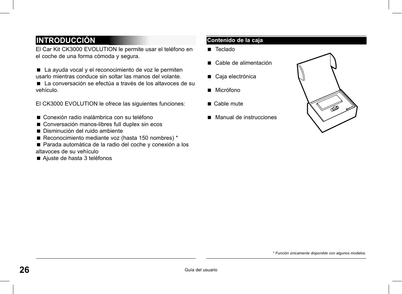 User's guide Português Nederlands Italiano Español Guía del usuario Français English Español INTRODUCCIÓN Contenido de la caja El Car Kit CK3000 EVOLUTION le permite usar el teléfono en el coche de una forma cómoda y segura. La ayuda vocal y el reconocimiento de voz le permiten usarlo mientras conduce sin soltar las manos del volante. La conversación se efectúa a través de los altavoces de su vehículo. Teclado Cable de alimentación Caja electrónica Micrófono El CK3000 EVOLUTION le ofrece las siguientes funciones: Cable mute Conexión radio inalámbrica con su teléfono Conversación manos-libres full duplex sin ecos Disminución del ruido ambiente Reconocimiento mediante voz (hasta 150 nombres) * Parada automática de la radio del coche y conexión a los altavoces de su vehículo Ajuste de hasta 3 teléfonos Manual de instrucciones