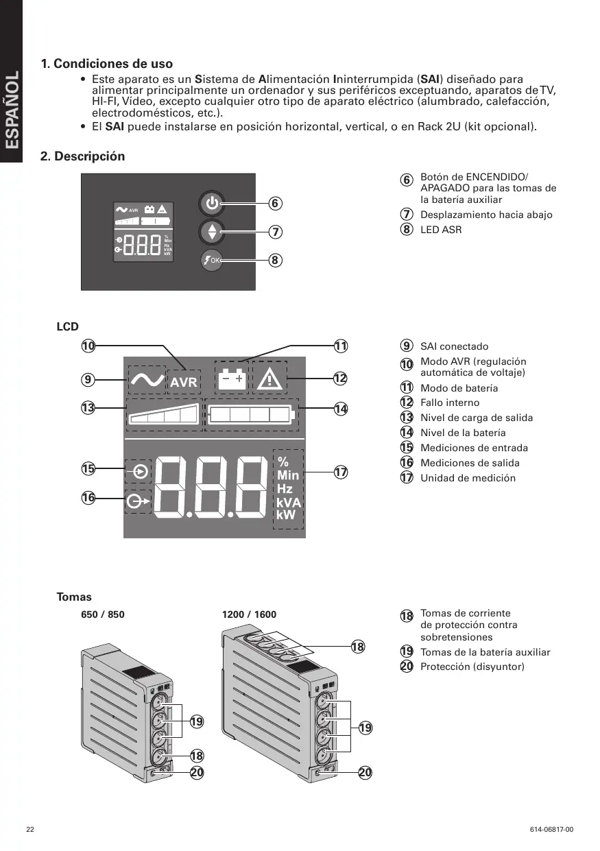 - Si la duración del corte de la red eléctrica sobrepasa la autonomía de la batería, el SAI se detiene y luego se enciende automáticamente cuando vuelve la red eléctrica. Tras su descarga completa, se necesitarán varias horas para restaurar su autonomía completa. Protección contra sobretensión: Todas las tomas incluyen la función de protección contra sobretensión. Interrupción de las tomas auxiliadas 19 Presionar durante más de 2 segundos el interruptor 6 .