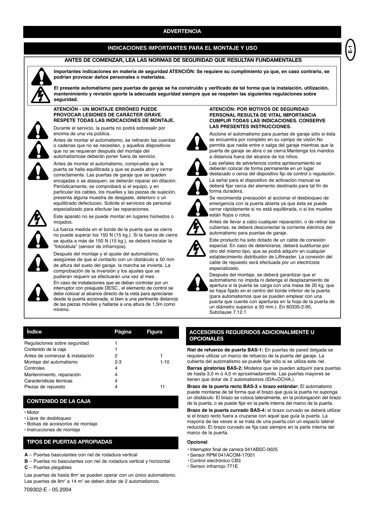 Regulaciones sobre seguridad Contenido de la caja Antes de comenzar & instalación Montaje del automatismo Controles Mantenimiento, reparación Características técnicas Piezas de repuesto