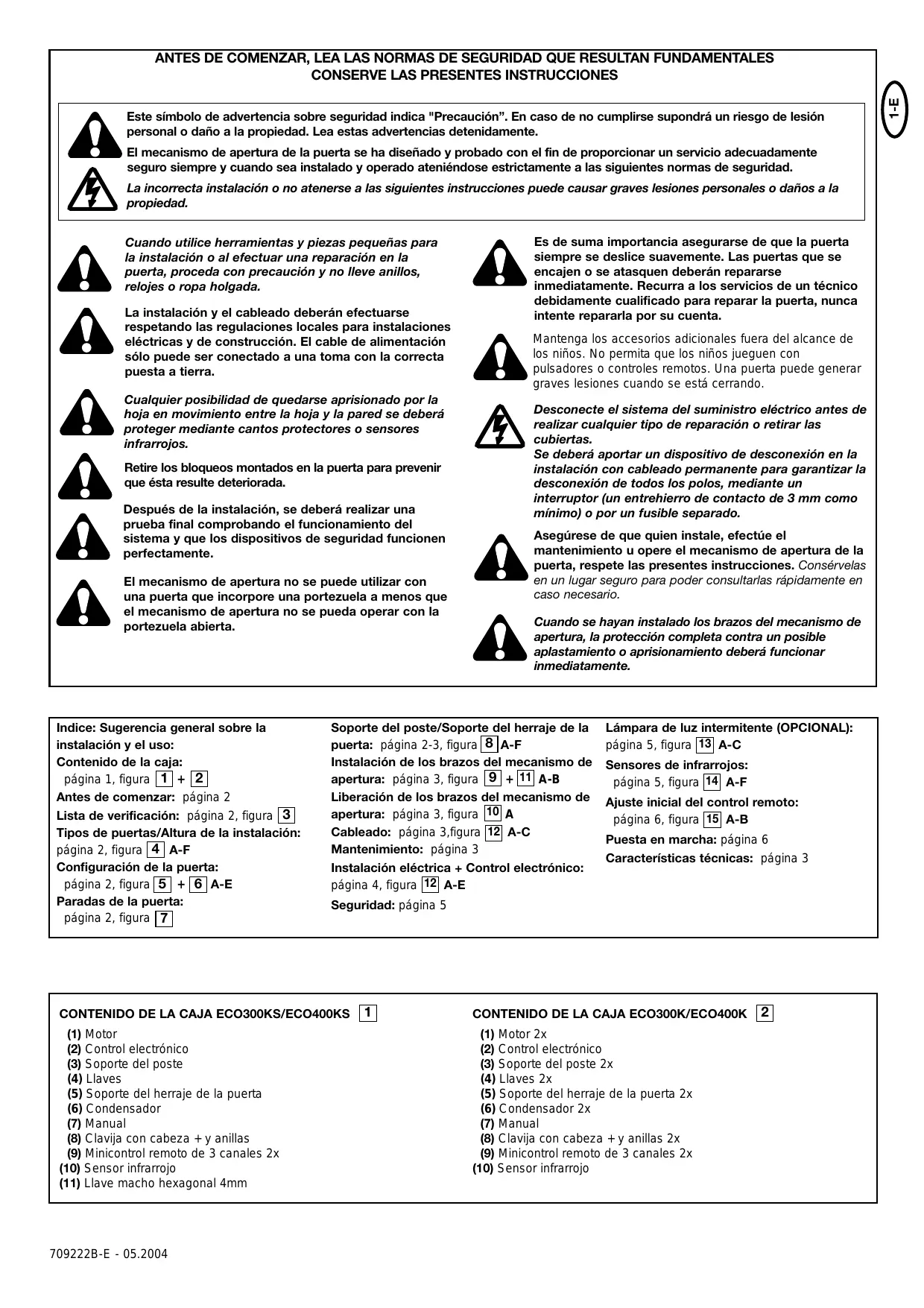 El mecanismo de apertura de la puerta se ha diseñado y probado con el fin de proporcionar un servicio adecuadamente seguro siempre y cuando sea instalado y operado ateniéndose estrictamente a las siguientes normas de seguridad. La incorrecta instalación o no atenerse a las siguientes instrucciones puede causar graves lesiones personales o daños a la propiedad. Cuando utilice herramientas y piezas pequeñas para la instalación o al efectuar una reparación en la puerta, proceda con precaución y no lleve anillos, relojes o ropa holgada. La instalación y el cableado deberán efectuarse respetando las regulaciones locales para instalaciones eléctricas y de construcción. El cable de alimentación sólo puede ser conectado a una toma con la correcta puesta a tierra. Cualquier posibilidad de quedarse aprisionado por la hoja en movimiento entre la hoja y la pared se deberá proteger mediante cantos protectores o sensores infrarrojos. Retire los bloqueos montados en la puerta para prevenir que ésta resulte deteriorada. Después de la instalación, se deberá realizar una prueba final comprobando el funcionamiento del sistema y que los dispositivos de seguridad funcionen perfectamente. El mecanismo de apertura no se puede utilizar con una puerta que incorpore una portezuela a menos que el mecanismo de apertura no se pueda operar con la portezuela abierta.