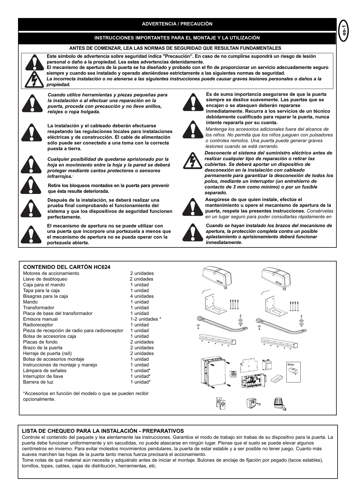 Herraje de puerta (rail) 2 unidades Bolsa de accesorios montaje 1 unidad Instrucciones de montaje y manejo 1 unidad Lämpara de señales 1 unidad* Interruptor de Ilave 1 unidad* Barrera de luz 1 unidad*