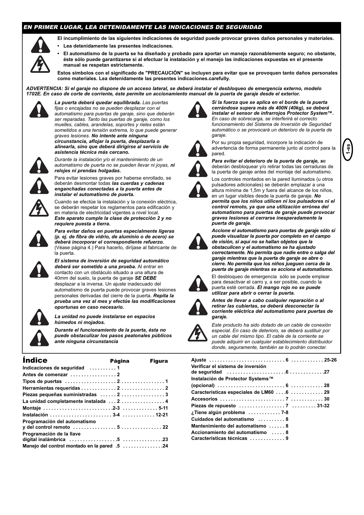 Para evitar el deterioro de la puerta de garaje, se deberán desbloquear y/o retirar todas las cerraduras de la puerta de garaje antes del montaje del automatismo. Los controles montados en la pared iluminados (u otros pulsadores adicionales) se deberán emplazar a una altura mínima de 1,5m y fuera del alcance de los niños, en un lugar visibles desde la puerta de garaje. No permita que los niños utilicen ni los pulsadores ni el control remoto, ya que una utilización errónea del automatismo para puertas de garaje puede provocar graves lesiones al cerrarse inesperadamente la puerta de garaje. Accione el automatismo para puertas de garaje sólo si puede visualizar la puerta por completo en el campo de visión, si aquí no se hallan objetos que la obstaculicen y el automatismo se ha ajustado correctamente. No permita que nadie entre o salga del garaje mientras que la puerta de garaje se abre o cierre. No permita que los niños jueguen cerca de la puerta de garaje mientras se acciona el automatismo. El desbloqueo de emergencia sólo se puede emplear para desactivar el carro y, a ser posible, cuando la puerta esté cerrada. El mango rojo no se puede utilizar para abrir o cerrar la puerta. Antes de llevar a cabo cualquier reparación o al retirar las cubiertas, se deberá desconectar la corriente eléctrica del automatismo para puertas de garaje. Este producto ha sido dotado de un cable de conexión especial. En caso de deterioro, se deberá sustituir por un cable del mismo tipo. El cable de la corriente se puede adquirir en cualquier establecimiento distribuidor donde, seguramente, también se lo podrán conectar. Ajuste . . . . . . . . . . . . . . . . . . . . . . . . . . . . 6 Verificar el sistema de inversión de seguridad . . . . . . . . . . . . . . . . . . . . . .6 Instalación de Protector Systems™ (opcional) . . . . . . . . . . . . . . . . . . . . . . . . . 6 1. Compruebe el estado de la pared y del techo por encima de la puerta de garaje. El soporte del cabezal deberá colocarse firmemente a los soportes de la estructura autoportantes. 2. ¿Está el techo del garaje revocado, revestido, encofrado, o similar? Puede que se requieran tacos especiales u otras piezas (sin incluir) para efectuar la fijación. 3. Dependiendo del tipo de construcción de la puerta de garaje, puede que se requiera un brazo de puerta especial. 4. ¿Está el garaje dotado de un acceso adicional además de la puerta de garaje? Si no existe ningún acceso adicional al garaje, se recomienda encarecidamente montar un desbloqueo de emergencia externo, modelo 1702E.