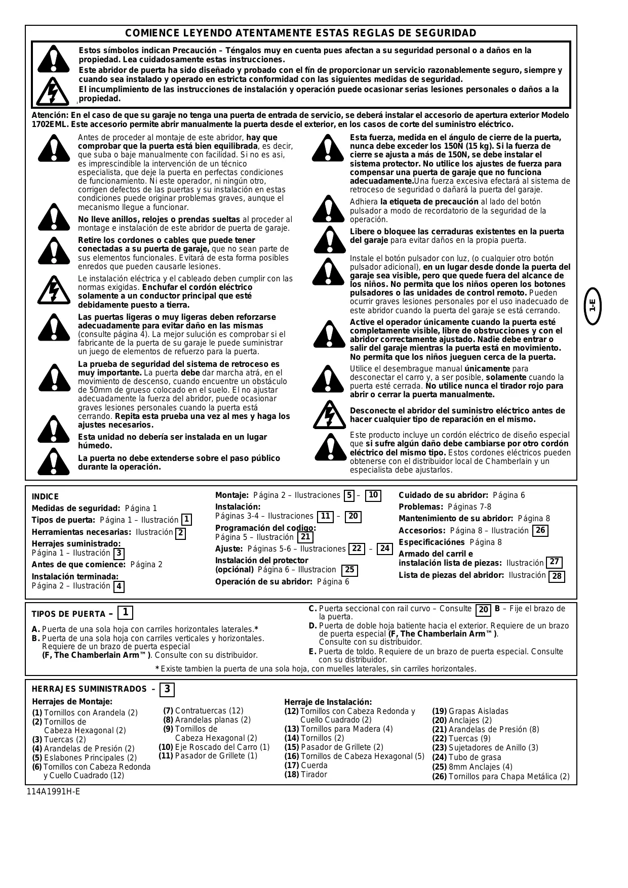 COMIENCE LEYENDO ATENTAMENTE ESTAS REGLAS DE SEGURIDAD Estos símbolos indican Precaución – Téngalos muy en cuenta pues afectan a su seguridad personal o a daños en la propiedad. Lea cuidadosamente estas instrucciones. Este abridor de puerta ha sido diseñado y probado con el fín de proporcionar un servicio razonablemente seguro, siempre y cuando sea instalado y operado en estricta conformidad con las siguientes medidas de seguridad. El incumplimiento de las instrucciones de instalación y operación puede ocasionar serias lesiones personales o daños a la propiedad. Atención: En el caso de que su garaje no tenga una puerta de entrada de servicio, se deberá instalar el accesorio de apertura exterior Modelo 1702EML. Este accesorio permite abrir manualmente la puerta desde el exterior, en los casos de corte del suministro eléctrico.