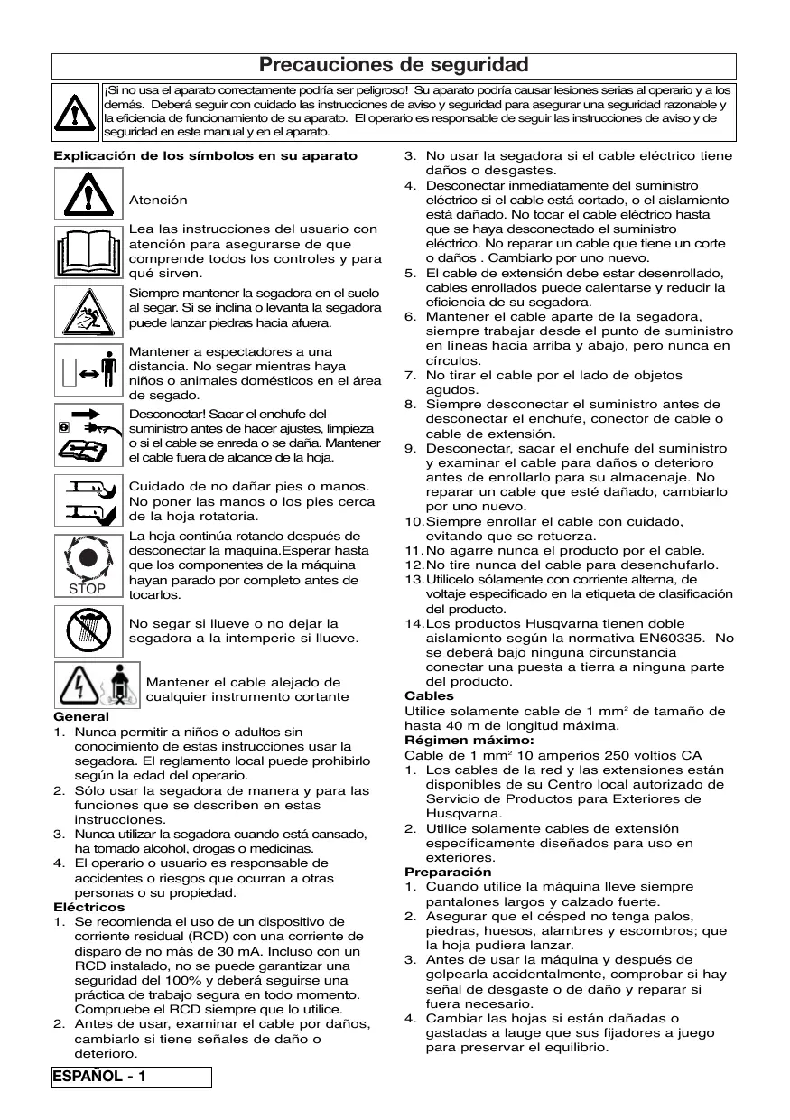 12.No tire nunca del cable para desenchufarlo. 13.Utilicelo sólamente con corriente alterna, de voltaje especificado en la etiqueta de clasificación del producto. 14.Los productos Husqvarna tienen doble aislamiento según la normativa EN60335. No se deberá bajo ninguna circunstancia conectar una puesta a tierra a ninguna parte del producto. Cables Utilice solamente cable de 1 mm2 de tamaño de hasta 40 m de longitud máxima. Régimen máximo: Cable de 1 mm2 10 amperios 250 voltios CA
