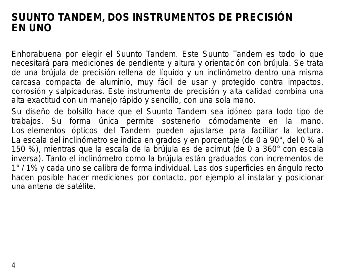 SUUNTO TANDEM, DOS INSTRUMENTOS DE PRECISIÓN EN UNO Enhorabuena por elegir el Suunto Tandem. Este Suunto Tandem es todo lo que necesitará para mediciones de pendiente y altura y orientación con brújula. Se trata de una brújula de precisión rellena de líquido y un inclinómetro dentro una misma carcasa compacta de aluminio, muy fácil de usar y protegido contra impactos, corrosión y salpicaduras. Este instrumento de precisión y alta calidad combina una alta exactitud con un manejo rápido y sencillo, con una sola mano. Su diseño de bolsillo hace que el Suunto Tandem sea idóneo para todo tipo de trabajos. Su forma única permite sostenerlo cómodamente en la mano. Los elementos ópticos del Tandem pueden ajustarse para facilitar la lectura. La escala del inclinómetro se indica en grados y en porcentaje (de 0 a 90°, del 0 % al 150 %), mientras que la escala de la brújula es de acimut (de 0 a 360° con escala inversa). Tanto el inclinómetro como la brújula están graduados con incrementos de 1° / 1% y cada uno se calibra de forma individual. Las dos superficies en ángulo recto hacen posible hacer mediciones por contacto, por ejemplo al instalar y posicionar una antena de satélite.