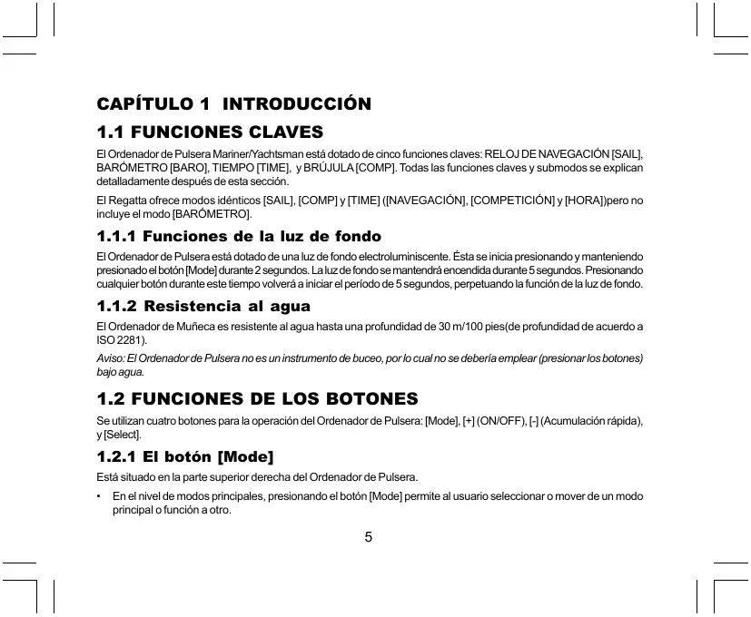 El Ordenador de Puisera Marine Yachisman estä dotado de dico funciones claves: RELOU DE NAVEGACIONSAL] BAROMETRO [BARO] TIEMPO [TIME], y BRUJULAICOMP] Todas las funciones claves y submodos se expiican detalladamente después de esta seccôn. El Regatla ofrece modos idénticos [SAIL], [COMP]y TIME] (NAVEGACIÔN], [COMPETICIÔN] y HORANipero no ineluye el modo [BARÔMETRO]