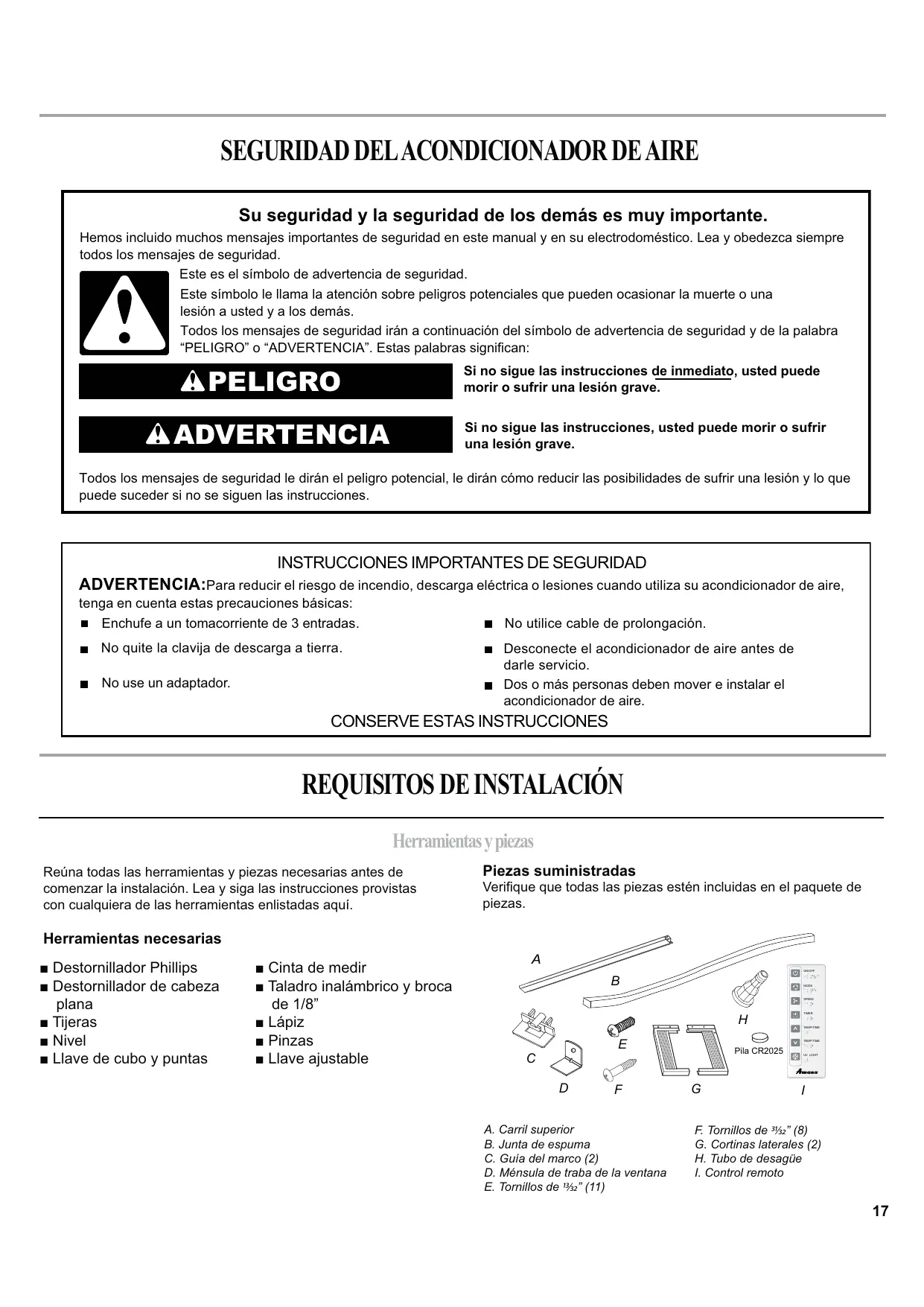 ADVERTENCIA:Para reducir el riesgo de incendio, descarga eléctrica o lesiones cuando utiliza su acondicionador de aire, tenga en cuenta estas precauciones básicas: No utilice cable de prolongación. Enchufe a un tomacorriente de 3 entradas. No quite la clavija de descarga a tierra. Desconecte el acondicionador de aire antes de darle servicio. Dos o más personas deben mover e instalar el acondicionador de aire. No use un adaptador.