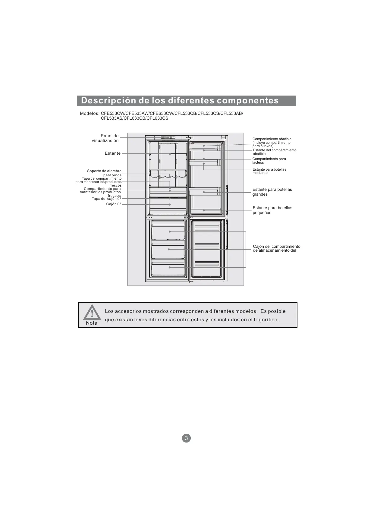 - Resolución de problemas -25 Por favor, lea detenidamente este manual de uso antes de utilizar el aparato. Conserve este manual para consulta futura. Inspeccione el aparato para comprobar si existe algún patrón de apariencia, color y olor. Principales características Fabricador de hielo automático y extraíble (sólo disponible en algunos modelos). La puerta del congelador se encuentra reemplazada por dos cajones. Esto puede facilitar el acceso a los alimentos con un ahorro de energía y comodidad (sólo disponible en algunos modelos). Estructura de estante medio. Sistema de iluminación innovador y de larga eficacia. Soporte para botellas de vino plegable. Gran cajón 0º con ajuste de humedad. Función de vacaciones. Configuración de la función de ENCENDIDO/APAGADO en el panel de visualización (sólo disponible en algunos modelos). Encendido/apagado del compartimiento de almacenamiento de el frigorífico por separado. Función de alarma inteligente: alarma automática de sobretemperatura, funcionamiento defectuoso y apertura de la puerta. Botones sensible al tacto (sólo disponibles en algunos modelos). Desodorante (sólo disponible en algunos modelos). Mantenimiento de los productos frescos a cero grados. Descripción de los diferentes componentes Modelos: CFE533CW/CFE533AW/CFE633CW/CFL533CB/CFL533CS/CFL533AB/ p. 23