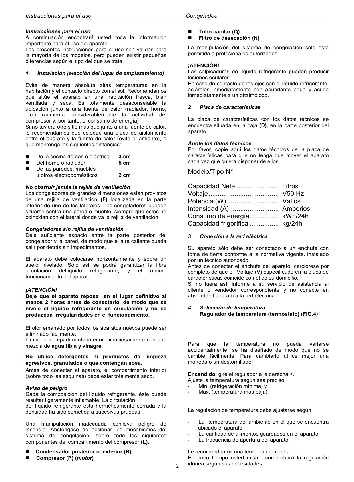 Placa de características La placa de características con los datos técnicos se encuentra situada en la caja (D), en la parte posterior del aparato. Anote los datos técnicos Por favor, copie aquí los datos técnicos de la placa de características para que no tenga que mover el aparato cada vez que quiera disponer de ellos. 3.cm 5 cm Modelo/Tipo N° 2 cm Capacidad Neta ....................... Voltaje...................................... Potencia (W) ............................ Intensidad (A)........................... Consumo de energía................ Capacidad frigorífica ................ No obstruir jamás la rejilla de ventilación Los congeladores de grandes dimensiones están provistos de una rejilla de ventilación (F) localizada en la parte inferior de uno de los laterales. Los congeladores pueden situarse contra una pared o mueble, siempre que estos no coincidan con el lateral donde va la rejilla de ventilación. Congeladores sin rejilla de ventilación Deje suficiente espacio entre la parte posterior del congelador y la pared, de modo que el aire caliente pueda salir por detrás sin impedimentos.