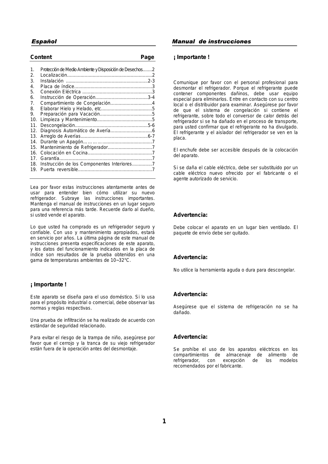 - Puerta reversible Comunique por favor con el personal profesional para desmontar el refrigerador. Porque el refrigerante puede contener componentes dañinos, debe usar equipo especial para eliminarlos. Entre en contacto con su centro local o el distribuidor para examinar. Asegúrese por favor de que el sistema de congelación si contiene el refrigerante, sobre todo el conversor de calor detrás del refrigerador si se ha dañado en el proceso de transporte, para usted confirmar que el refrigerante no ha divulgado. El refrigerante y el aislador del refrigerador se ven en la placa. El enchufe debe ser accesible después de la colocación del aparato. Si se daña el cable eléctrico, debe ser substituido por un cable eléctrico nuevo ofrecido por el fabricante o el agente autorizado de servicio. Lea por favor estas instrucciones atentamente antes de usar para entender bien cómo utilizar su nuevo refrigerador. Subraye las instrucciones importantes. Mantenga el manual de instrucciones en un lugar seguro para una referencia más tarde. Recuerde darlo al dueño, si usted vende el aparato. Advertencia: Lo que usted ha comprado es un refrigerador seguro y confiable. Con uso y mantenimiento apropiados, estará en servicio por años. La última página de este manual de instrucciones presenta especificaciones de este aparato, y los datos del funcionamiento indicados en la placa de índice son resultados de la prueba obtenidos en una gama de temperaturas ambientes de 10~32°C. Debe colocar el aparato en un lugar bien ventilado. El paquete de envío debe ser quitado. Advertencia: No utilice la herramienta aguda o dura para descongelar. ¡ Importante ! Advertencia: Este aparato se diseña para el uso doméstico. Si lo usa para el propósito industrial o comercial, debe observar las normas y reglas respectivas. Asegúrese que el sistema de refrigeración no se ha dañado. Una prueba de infiltración se ha realizado de acuerdo con estándar de seguridad relacionado. Advertencia: Para evitar el riesgo de la trampa de niño, asegúrese por favor que el cerrojo y la tranca de su viejo refrigerador están fuera de la operación antes del desmontaje. Se prohíbe el uso de los aparatos eléctricos en los compartimientos de almacenaje de alimento de refrigerador, con excepción los modelos recomendados por el fabricante. p. 7