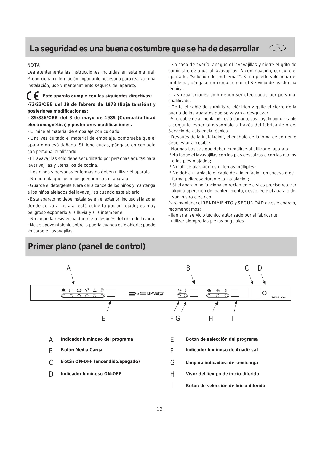 - Si el aparato no funciona correctamente o si es preciso realizar alguna operación de mantenimiento, desconecte el aparato del suministro eléctrico. Para mantener el RENDIMIENTO y SEGURIDAD de este aparato, recomendamos: - llamar al servicio técnico autorizado por el fabricante. - utilizar siempre las piezas originales. Primer plano (panel de control)