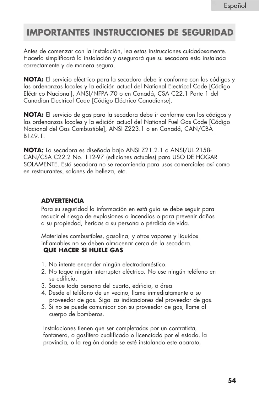 Antes de comenzar con la instalación, lea estas instrucciones cuidadosamente. Hacerlo simplificará la instalación y asegurará que su secadora esta instalada correctamente y de manera segura. Nota: El servicio eléctrico para la secadora debe ir conforme con los códigos y las ordenanzas locales y la edición actual del National Electrical Code [Código Eléctrico Nacional], ANSI/NFPA 70 o en Canadá, CSA C22.1 Parte 1 del Canadian Electrical Code [Código Eléctrico Canadiense]. Nota: El servicio de gas para la secadora debe ir conforme con los códigos y las ordenanzas locales y la edición actual del National Fuel Gas Code [Código Nacional del Gas Combustible], ANSI Z223.1 o en Canadá, CAN/CBA B149.1. Nota: La secadora es diseñada bajo ANSI Z21.2.1 o ANSI/UL 2158CAN/CSA C22.2 No. 112-97 (ediciones actuales) para USO DE HOGAR SOLAMENTE. Está secadora no se recomienda para usos comerciales así como en restaurantes, salones de belleza, etc. ADVERTENCIA Para su seguridad la información en está guía se debe seguir para reducir el riesgo de explosiones o incendios o para prevenir daños a su propiedad, heridas a su persona o pérdida de vida. Materiales combustibles, gasolina, y otros vapores y líquidos inflamables no se deben almacenar cerca de la secadora.