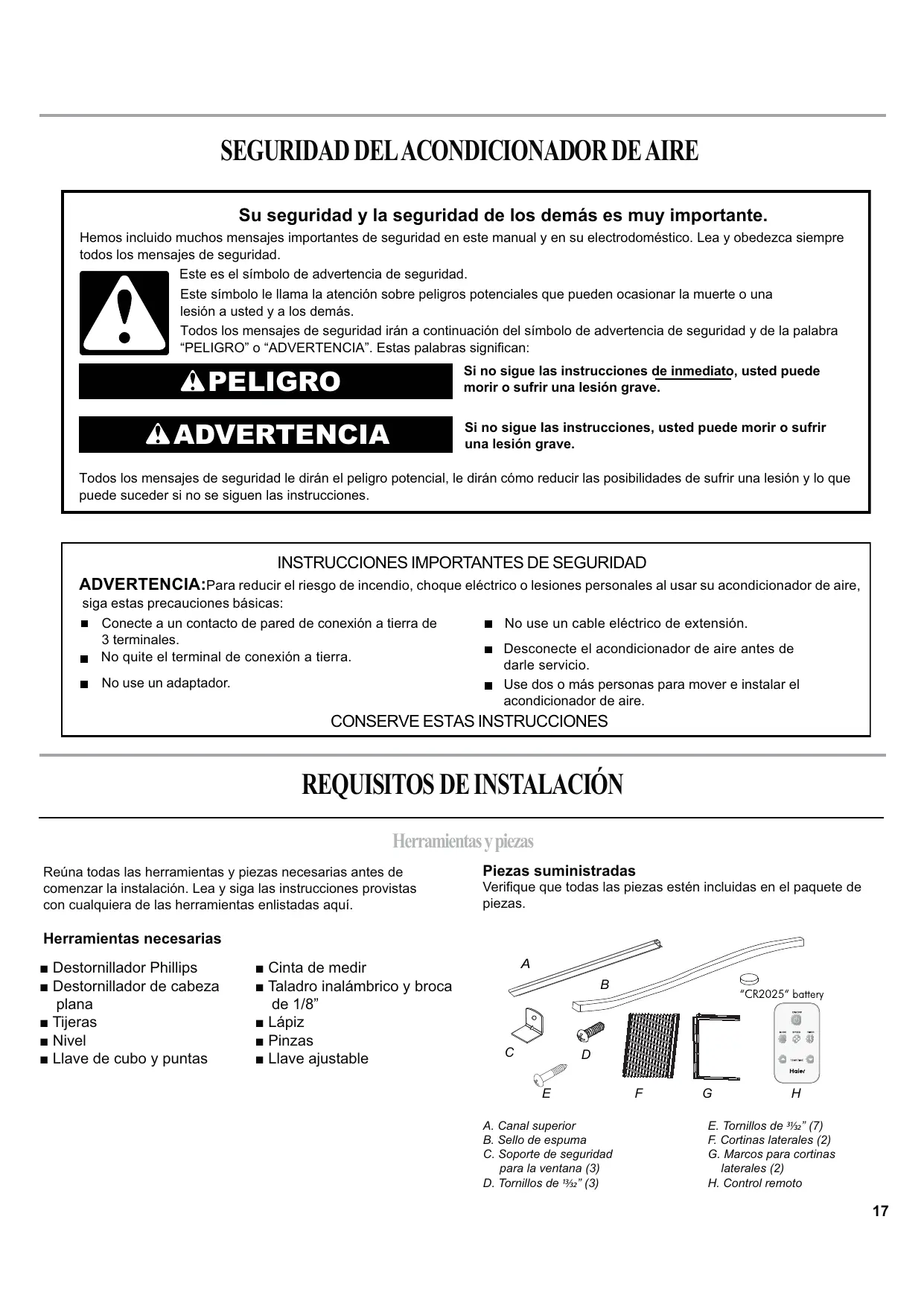 ADVERTENCIA:Para reducir el riesgo de incendio, choque eléctrico o lesiones personales al usar su acondicionador de aire, siga estas precauciones básicas: Conecte a un contacto de pared de conexión a tierra de 3 terminales. No quite el terminal de conexión a tierra. No use un adaptador. No use un cable eléctrico de extensión. Desconecte el acondicionador de aire antes de darle servicio. Use dos o más personas para mover e instalar el acondicionador de aire.