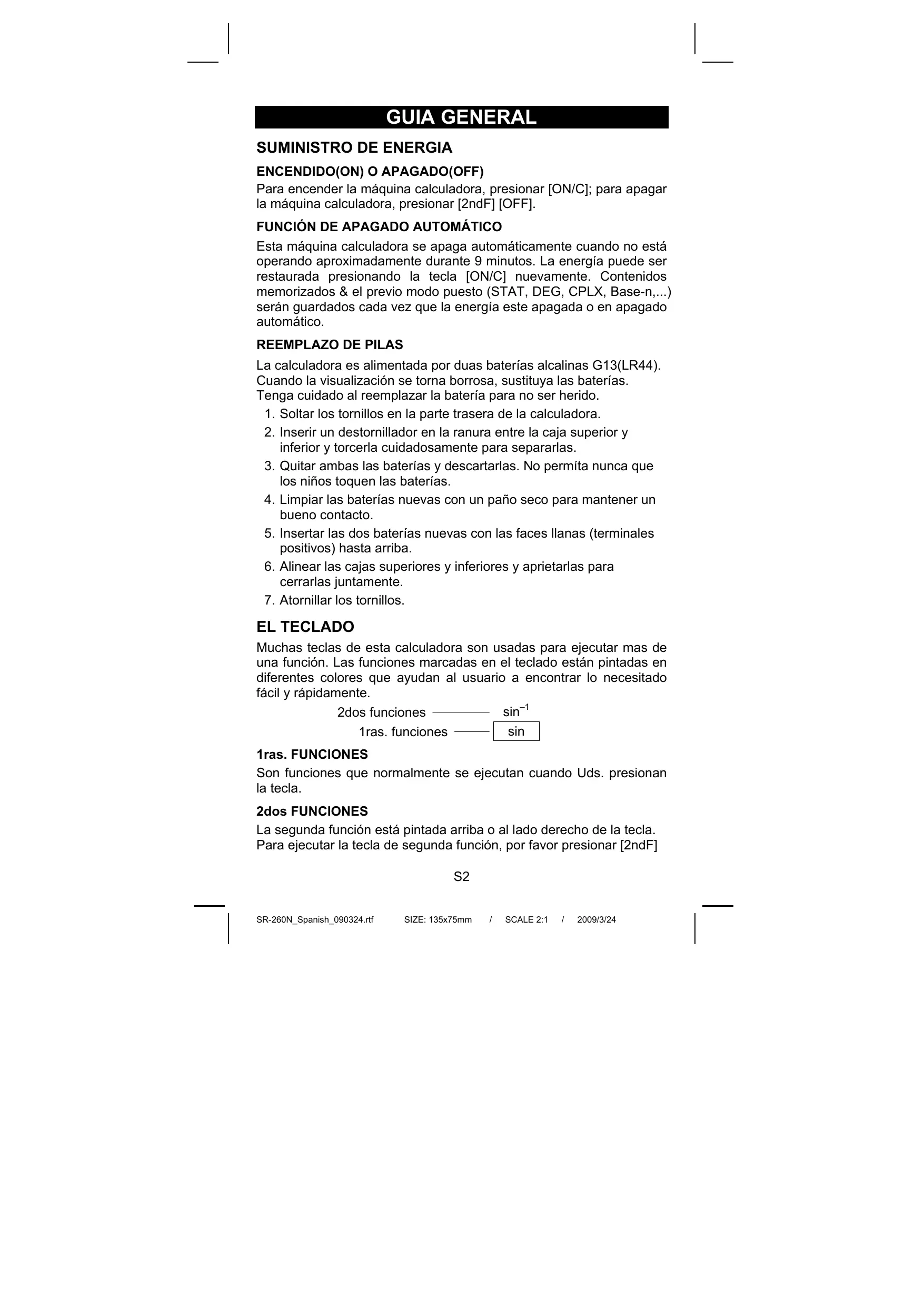 EL TECLADO Muchas teclas de esta calculadora son usadas para ejecutar mas de una función. Las funciones marcadas en el teclado están pintadas en diferentes colores que ayudan al usuario a encontrar lo necesitado fácil y rápidamente. 2dos funciones ───── sin 1ras. funciones ─── sin 1ras. FUNCIONES Son funciones que normalmente se ejecutan cuando Uds. presionan la tecla. 2dos FUNCIONES La segunda función está pintada arriba o al lado derecho de la tecla. Para ejecutar la tecla de segunda función, por favor presionar [2ndF] SR-260N_Spanish_090324.rtf SIZE: 135x75mm