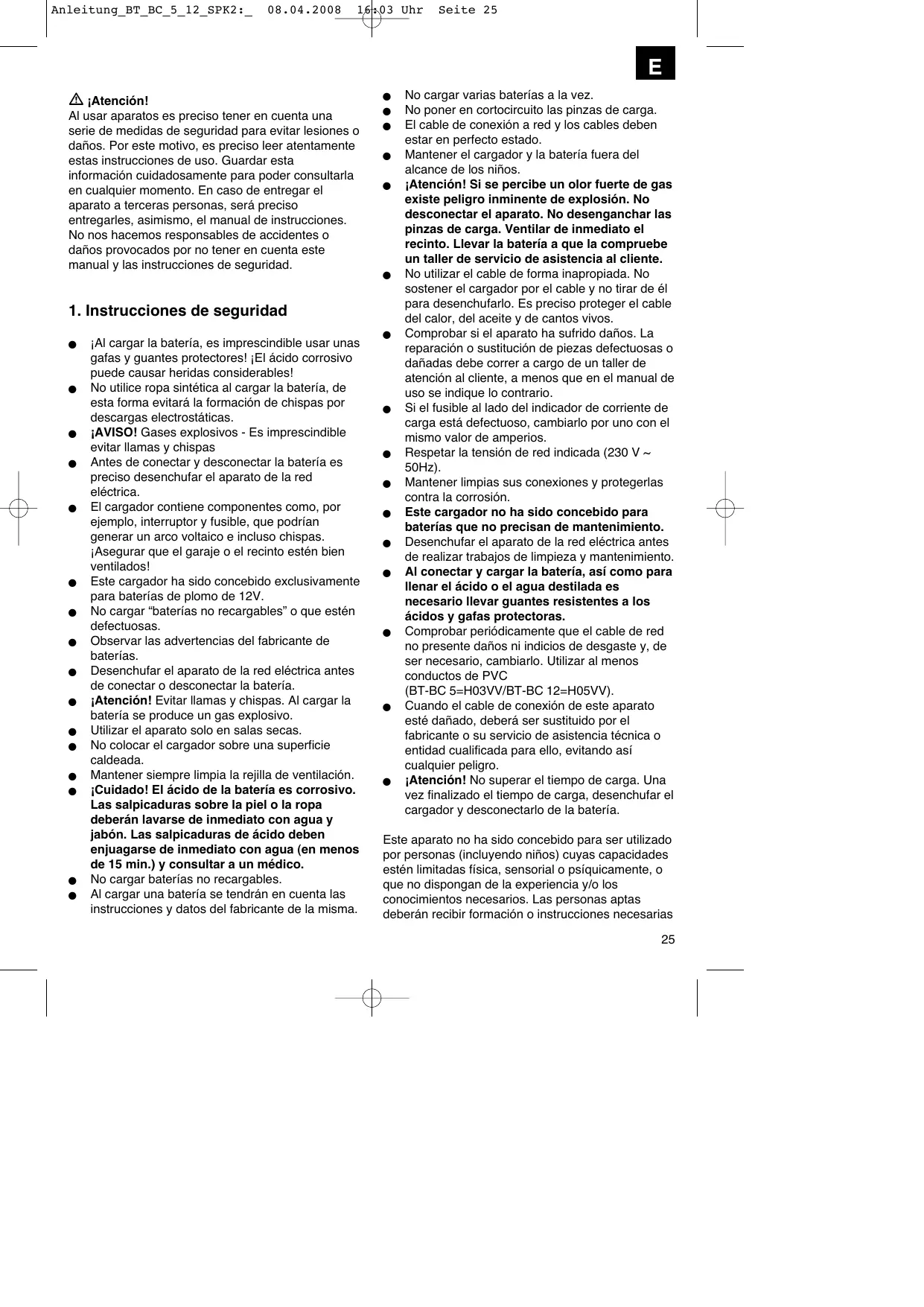 Anleitung_BT_BC_5 12 SPK2:_ 08.04.2008 sobre el funcionamiento del aparato por parte de una persona responsable para su seguridad. Vigilar a los niños para asegurarse de que no jueguen con el aparato. À jAvISo! Lea todas las instrucciones de seguridad e indicaciones. Elincumplimiento de dichas instrucciones e indicaciones puede provocar descargas, incendios ylo daños graves. Guarde todas las instrucciones de seguridad e indicaciones para posibles consultas posteriores. Eliminaciôn de residuos: Baterias: Deben eliminarse Ilevändolas a un taller de automéviles, a un lugar de recogida especial o a una entidad de recolecciôn oficial de desechos industriales. Informarse en cualquier entidad local.
