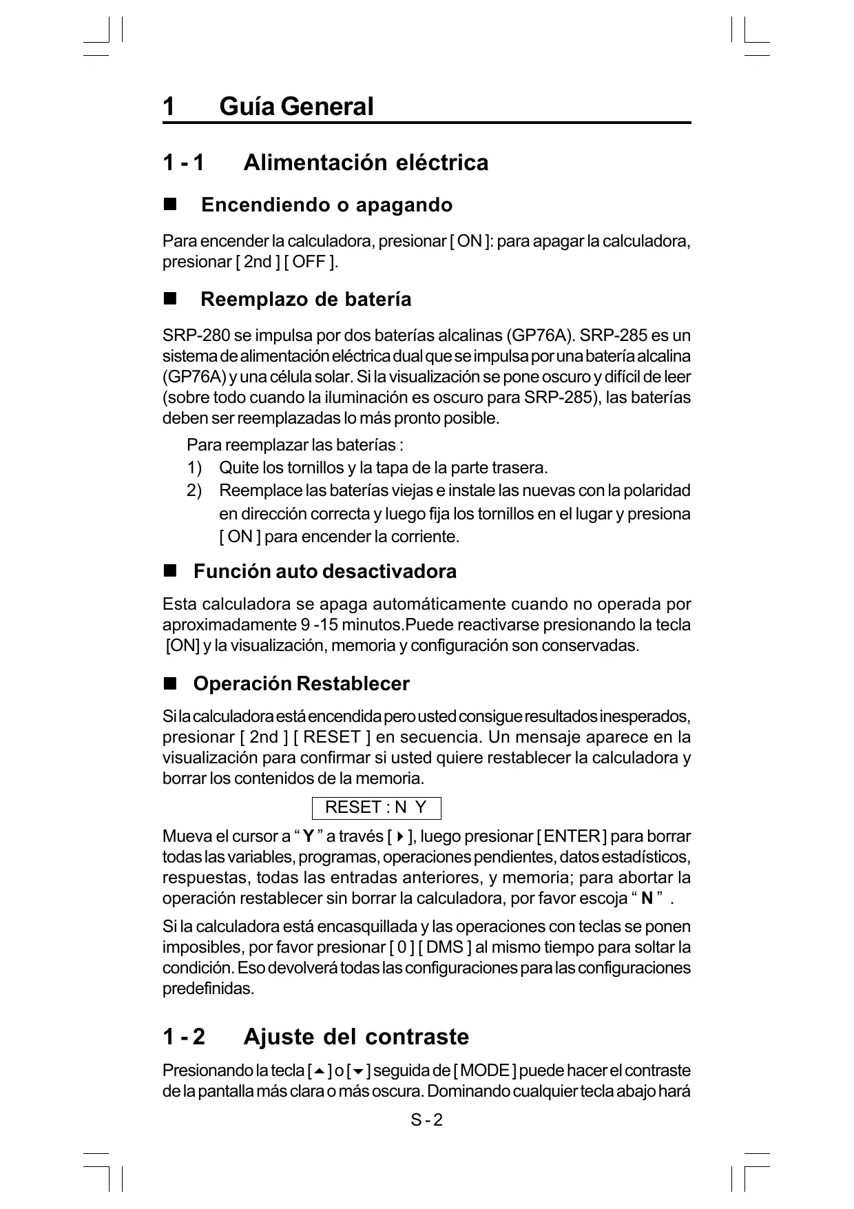 Alimentación Eléctrica .............................................. S - 2 Ajuste de Contraste ................................................. S - 2 Lectura de la Visualización ....................................... S - 3 Marcación de las teclas ............................................. S - 4 Antes de empezar los cálculos ................................. S - 4 Seleccionando un modo ............................................... S - 4 Seleccionando un elemento de los menús de la visualización ................................................................................... S - 4 Usando teclas “2nd” .................................................... S - 4 Cursor ........................................................................ S - 5 Haciendo correcciones durante la entrada ................... S - 5 Función de repetición (replay) ...................................... S - 5 Función de visualización de la posición de error ........... S - 6 Función de memoria .................................................... S - 6 Orden de operaciones ................................................. S - 6 Exactitud y Capacidad .................................................. S - 7 Condiciones de error ................................................... S - 9 Cálculo aritmético .................................................... S - 10 Formatos de visualización ...................................... S - 10 Cálculos de paréntesis ............................................ S - 10 Cálculo de porcentaje ............................................. S - 11 Función del cálculo continuo ................................. S - 11 Función de respuesta .............................................. S - 11 Logaritmos y Antilogaritmos .................................. S - 11 Cálculo de fracción .................................................. S - 12 Conversión de unidades del ángolo ...................... S - 12 Funciones Trigonometricas/Tri. Inversas .............. S - 13 Funciones Hiperbólicas/Hip. Inversas ................... S - 13 Transformación de coordenadas ........................... S - 13 Probabilidad ............................................................. S - 13 Otras funciones ....................................................... S - 14 Conversión de la unidad ......................................... S - 14 Constantes de Física ............................................... S - 14 Conversiones de bases ........................................... S - 16 Expresiones negativas ............................................ S - 16 Operaciones aritméticas básicas para bases .......... S - 17 Operaciones lógicas ................................................ S - 17 Encendiendo o apagando Para encender la calculadora, presionar [ ON ]: para apagar la calculadora, presionar [ 2nd ] [ OFF ]. Reemplazo de batería SRP-280 se impulsa por dos baterías alcalinas (GP76A). SRP-285 es un sistema de alimentación eléctrica dual que se impulsa por una batería alcalina (GP76A) y una célula solar. Si la visualización se pone oscuro y difícil de leer (sobre todo cuando la iluminación es oscuro para SRP-285), las baterías deben ser reemplazadas lo más pronto posible. Para reemplazar las baterías :