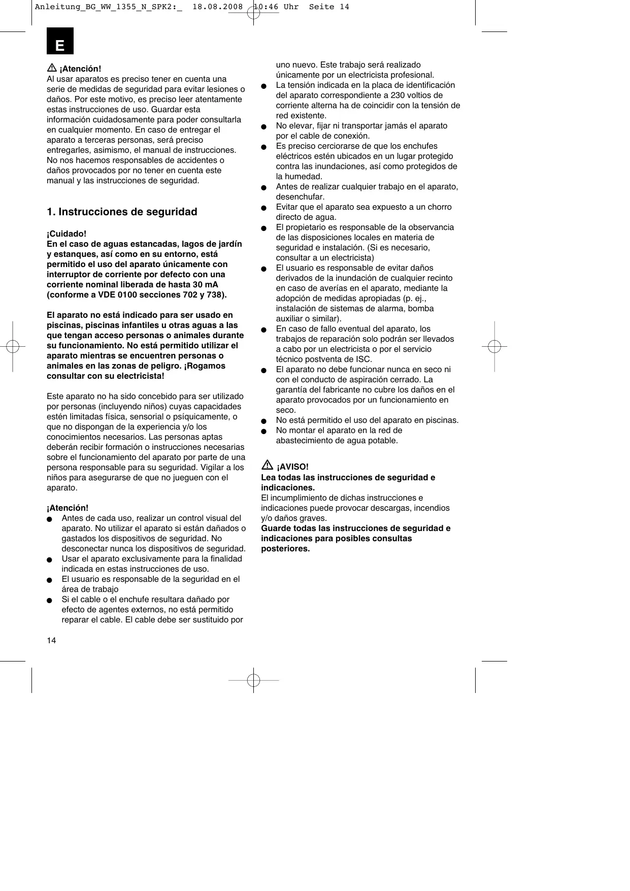 ¡Cuidado! En el caso de aguas estancadas, lagos de jardín y estanques, así como en su entorno, está permitido el uso del aparato únicamente con interruptor de corriente por defecto con una corriente nominal liberada de hasta 30 mA (conforme a VDE 0100 secciones 702 y 738). El aparato no está indicado para ser usado en piscinas, piscinas infantiles u otras aguas a las que tengan acceso personas o animales durante su funcionamiento. No está permitido utilizar el aparato mientras se encuentren personas o animales en las zonas de peligro. ¡Rogamos consultar con su electricista! Este aparato no ha sido concebido para ser utilizado por personas (incluyendo niños) cuyas capacidades estén limitadas física, sensorial o psíquicamente, o que no dispongan de la experiencia y/o los conocimientos necesarios. Las personas aptas deberán recibir formación o instrucciones necesarias sobre el funcionamiento del aparato por parte de una persona responsable para su seguridad. Vigilar a los niños para asegurarse de que no jueguen con el aparato. ¡Atención!
