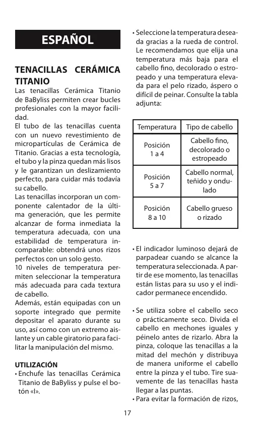 TITANIO Las tenacillas Cerámica Titanio de BaByliss permiten crear bucles profesionales con la mayor facilidad. El tubo de las tenacillas cuenta con un nuevo revestimiento de micropartículas de Cerámica de Titanio. Gracias a esta tecnología, el tubo y la pinza quedan más lisos y le garantizan un deslizamiento perfecto, para cuidar más todavía su cabello. Las tenacillas incorporan un componente calentador de la última generación, que les permite alcanzar de forma inmediata la temperatura adecuada, con una estabilidad de temperatura incomparable: obtendrá unos rizos perfectos con un solo gesto. 10 niveles de temperatura permiten seleccionar la temperatura más adecuada para cada textura de cabello. Además, están equipadas con un soporte integrado que permite depositar el aparato durante su uso, así como con un extremo aislante y un cable giratorio para facilitar la manipulación del mismo. Temperatura Tipo de cabello Posición 1a4 Cabello fino, decolorado o estropeado Posición 5a7 Cabello normal, teñido y ondulado Posición 8 a 10 Cabello grueso o rizado