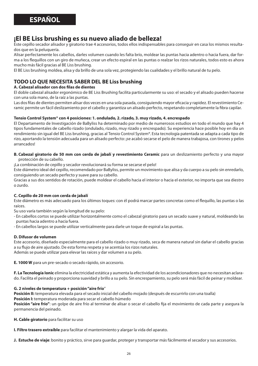 La double tête lissante ergonomique de BE Liss brushing rend son utilisation particulièrement aisée : le séchage et le lissage peuvent se faire avec une seule main de la racine aux pointes! Les deux rangées de dents permettent deux lissages en un seul geste pour plus d’efficacité et de rapidité. Leur revêtement Ceramic offre une glisse parfaite sur le cheveu et garantit un lissage optimal, dans le respect total de la fibre capillaire. Tensio Control System® 4 réglages : 1. ondulés, 2. bouclés, 3. frisés, 4. crépus La Recherche BaByliss a déterminé par de nombreuses études à travers le monde l’existence de 4 types fondamentaux de frisure (ondulé, bouclé, frisé, crépu). Son expertise permet aujourd’hui d’apporter à BE Liss brushing une performance inégalée grâce au Tensio Control System®. Cette technologie brevetée permet d’adapter à chacun des types de frisure la tension adéquate pour un lissage parfait : finis les tiraillements et les cheveux arrachés lors de brushings trop laborieux ! B. L a tête rotative diamètre 50mm en poils de sanglier, avec revêtement Ceramic pour une glisse parfaite et une meilleure protection de votre cheveu. La combinaison « brosse/sèche-cheveux » va révolutionner votre geste brushing ! Ce diamètre de brosse idéal, recommandé par BaByliss, effectue un mouvement lisse et gonflant sans emmêler les cheveux, avec le meilleur résultat de brushing pour des cheveux plein de douceur. Grâce à ses 2 sens de rotation, le brushing peut se faire vers l’intérieur ou vers l’extérieur, que vous soyez droitière ou gauchère. C. La brosse ronde diamètre 20mm en poils de sanglier Ce diamètre est plus spécialement adapté pour les finitions : elle va accentuer la mise en forme de certaines mèches comme la frange, les pointes ou la racine. Son utilisation peut aussi varier selon la longueur de cheveux : - sur cheveux courts, elle s’utilisera horizontalement comme la tête rotative pour un brushing souple et naturel, avec effet intérieur ou extérieur. - sur cheveux longs, elle s’utilisera verticalement pour un effet boucles spirales sur les pointes. D. Le diffuseur volume Spécialement conçu pour les cheveux bouclés ou frisés, cet accessoire sèche les cheveux naturellement, sans les agresser grâce à un flux d’air adapté. Les boucles naturelles sont ainsi respectées et mises en valeur. De plus, il peut s’utiliser pour décoller la racine et donner du volume à vos cheveux. E. 1000 W pour un séchage ou un pré-séchage rapide, sans accessoire. F. La Technologie Ionic permet de maîtriser l’électricité statique et aussi de renforcer l’efficacité de soins capillaires non rincés. Elle facilite le coiffage et donne de la brillance et de la douceur à vos cheveux. Sans frisottis, ils seront plus faciles à coiffer et à mettre en forme. G. 2 niveaux de températures + position « air frais » P osition II : température élevée pour le pré-séchage des cheveux mouillés (après essorage avec une serviette) P osition I : température modérée pour le séchage des cheveux humides P osition « air frais » : le coup d’air frais en fin de lissage ou de brushing fixe le mouvement de chaque mèche et lui confère un effet « longue durée » H. Cordon rotatif pour une utilisation pratique I. Filtre arrière amovible pour un entretien facile de l’appareil et prolonger sa durée de vie J. Trousse de rangement : esthétique et pratique, elle facilite le rangement, la protection et le transport de l’appareil et de ses accessoires.