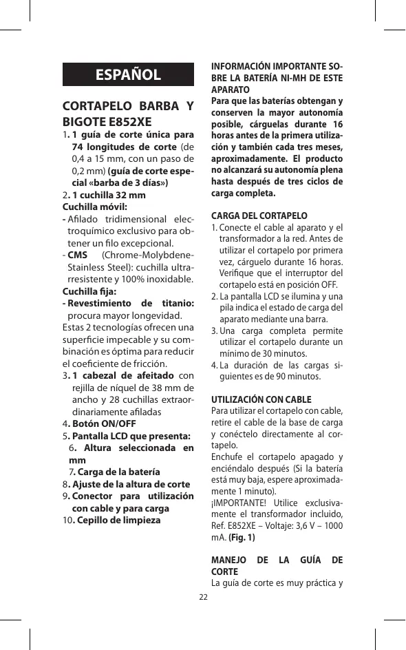 CARGA DEL CORTAPELO 1. Conecte el cable al aparato y el transformador a la red. Antes de utilizar el cortapelo por primera vez, cárguelo durante 16 horas. Verifique que el interruptor del cortapelo está en posición OFF. 2. L a pantalla LCD se ilumina y una pila indica el estado de carga del aparato mediante una barra. 3. Una carga completa permite utilizar el cortapelo durante un mínimo de 30 minutos. 4. L a duración de las cargas siguientes es de 90 minutos. UTILIZACIÓN CON CABLE Para utilizar el cortapelo con cable, retire el cable de la base de carga y conéctelo directamente al cortapelo. Enchufe el cortapelo apagado y enciéndalo después (Si la batería está muy baja, espere aproximadamente 1 minuto). ¡IMPORTANTE! Utilice exclusivamente el transformador incluido, Ref. E852XE – Voltaje: 3,6 V – 1000 mA. (Fig. 1) MANEJO DE LA GUÍA DE CORTE La guía de corte es muy práctica y 22