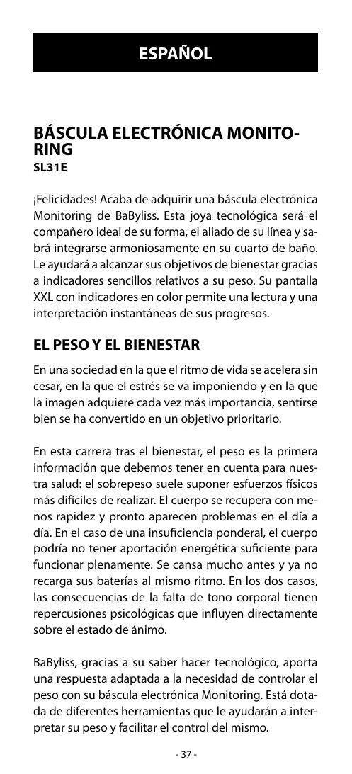 En esta carrera tras el bienestar, el peso es la primera información que debemos tener en cuenta para nuestra salud: el sobrepeso suele suponer esfuerzos físicos más difíciles de realizar. El cuerpo se recupera con menos rapidez y pronto aparecen problemas en el día a día. En el caso de una insuficiencia ponderal, el cuerpo podría no tener aportación energética suficiente para funcionar plenamente. Se cansa mucho antes y ya no recarga sus baterías al mismo ritmo. En los dos casos, las consecuencias de la falta de tono corporal tienen repercusiones psicológicas que influyen directamente sobre el estado de ánimo. BaByliss, gracias a su saber hacer tecnológico, aporta una respuesta adaptada a la necesidad de controlar el peso con su báscula electrónica Monitoring. Está dotada de diferentes herramientas que le ayudarán a interpretar su peso y facilitar el control del mismo. - 37 -