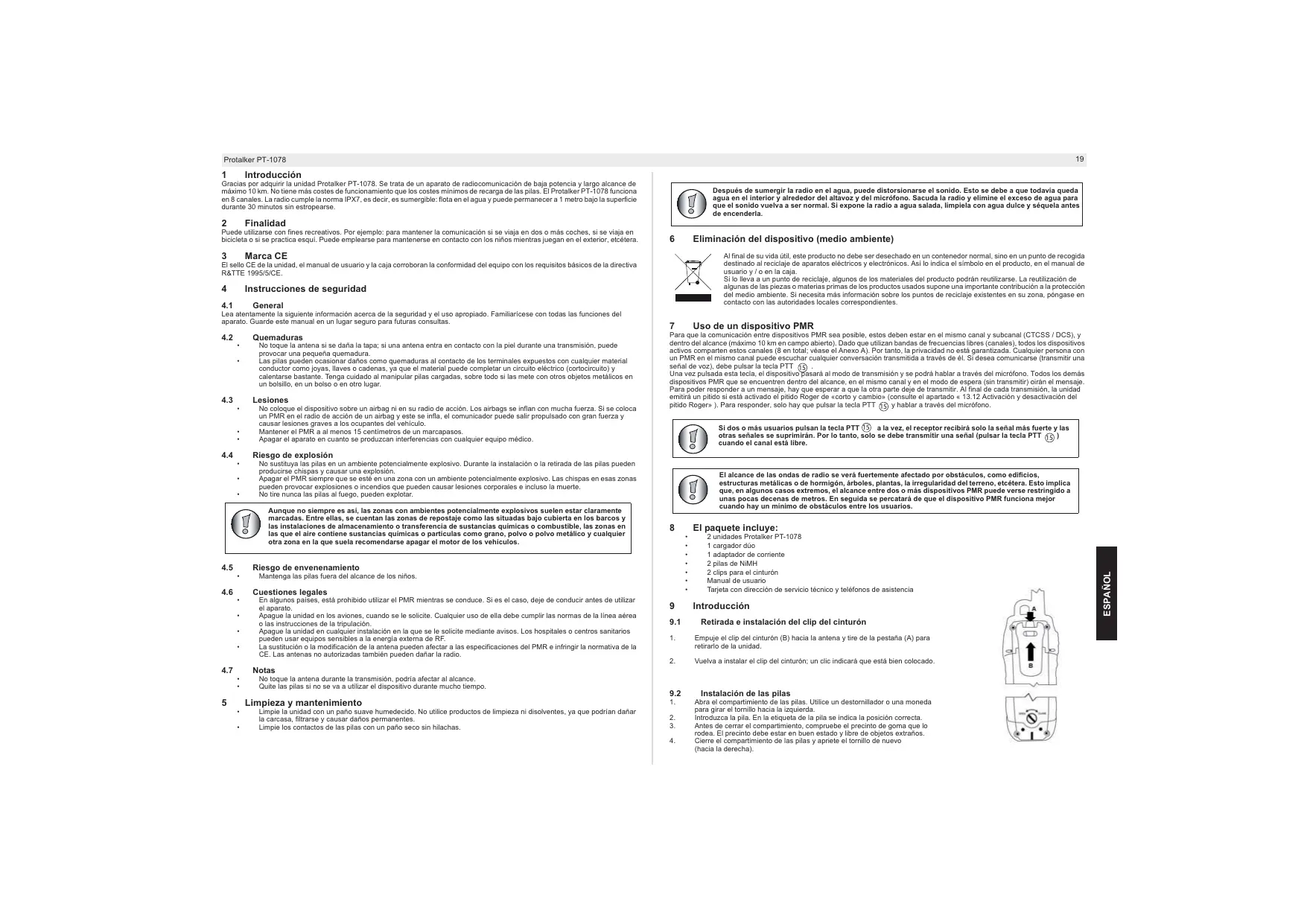 Gracias por acquirar lainstitutional Protalker PT-1078. Se tratate aapanato de radiocomunicacion de bajo potencia y largo alcance de maximo 10km . No THERE mares costes de functiormo que los costes minimos de recarga de las pilas. El Protalker PT-1078 funca en 8 canales. La radio cumple la normal IPX7, es decir, es sumergeble: flota en el agua y可以使 permanecer a un metro bajo la superficie durante 30 minutes sin estropearse.