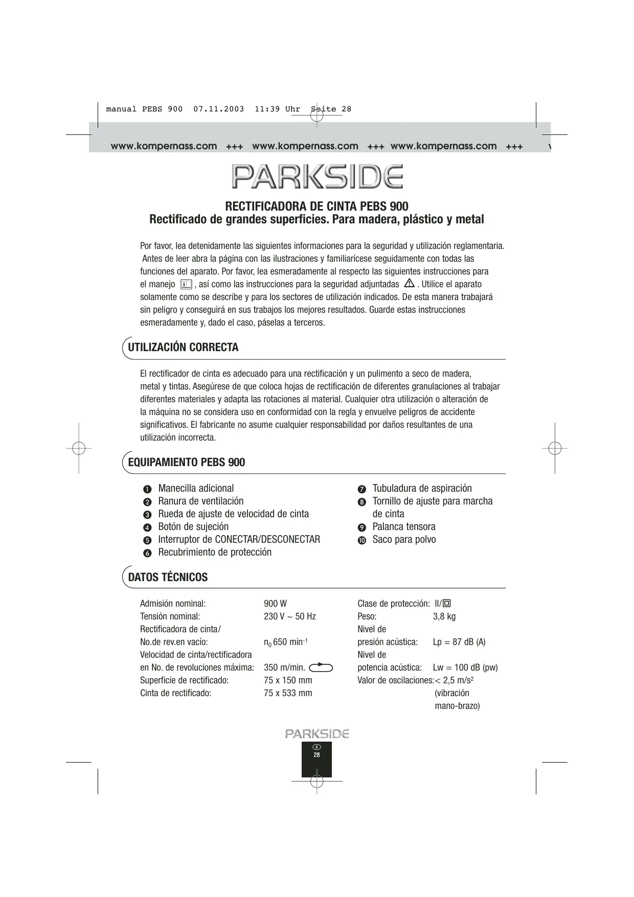 MANUAL DE USUARIO KH 3115 BELT SANDER PARKSIDE