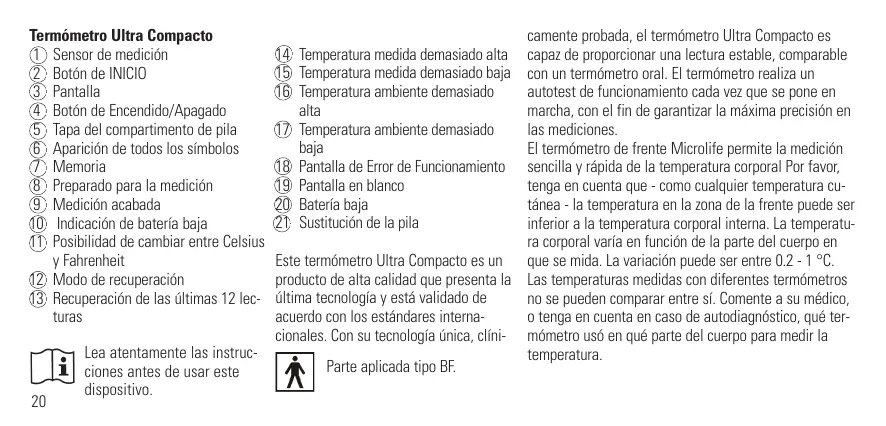 Lea atentamente las instrucciones antes de usar este dispositivo. camente probada, el termómetro Ultra Compacto es capaz de proporcionar una lectura estable, comparable con un termómetro oral. El termómetro realiza un autotest de funcionamiento cada vez que se pone en marcha, con el fin de garantizar la máxima precisión en las mediciones. El termómetro de frente Microlife permite la medición sencilla y rápida de la temperatura corporal Por favor, tenga en cuenta que - como cualquier temperatura cutánea - la temperatura en la zona de la frente puede ser inferior a la temperatura corporal interna. La temperatura corporal varía en función de la parte del cuerpo en Este termómetro Ultra Compacto es un que se mida. La variación puede ser entre 0.2 - 1 °C. producto de alta calidad que presenta la Las temperaturas medidas con diferentes termómetros última tecnología y está validado de no se pueden comparar entre sí. Comente a su médico, acuerdo con los estándares internao tenga en cuenta en caso de autodiagnóstico, qué tercionales. Con su tecnología única, clíni- mómetro usó en qué parte del cuerpo para medir la temperatura. Parte aplicada tipo BF. 14 Temperatura medida demasiado alta 15 Temperatura medida demasiado baja 16 Temperatura ambiente demasiado alta 17 Temperatura ambiente demasiado baja 18 Pantalla de Error de Funcionamiento 19 Pantalla en blanco 20 Batería baja 21 Sustitución de la pila Un efecto fisiológico básico, llamado vasoconstricción, puede ocurrir en la fase temprana de la fiebre, resultando en un efecto de piel fría, por lo que la temperatura registrada usando un termómetro de frente puede ser sospechosamente baja. Si el resultado de medición no se correspondiera con el estado del paciente o si fuese sospechosamente baja, repita la medición cada 15 minutos o contraste el resultado tomando otra medición de la temperatura corporal interna, por ejemplo, usando un termómetro IR de oído o un termómetro rectal. Índice