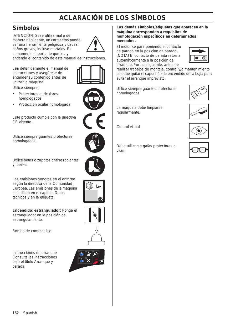 Protección ocular homologada Los demás símbolos/etiquetas que aparecen en la máquina corresponden a requisitos de homologación específicos en determinados mercados. El motor se para poniendo el contacto de parada en la posición de parada. ¡NOTA! El contacto de parada retorna automáticamente a la posición de arranque. Por consiguiente, antes de realizar trabajos de montaje, control y/o mantenimiento se debe quitar el capuchón de encendido de la bujía para evitar el arranque imprevisto. Utilice siempre guantes protectores homologados. La máquina debe limpiarse regularmente. Este producto cumple con la directiva CE vigente. Control visual. Utilice siempre guantes protectores homologados. Debe utilizarse gafas protectoras o visor. Utilice botas o zapatos antirresbalantes y fuertes. Las emisiones sonoras en el entorno según la directiva de la Comunidad Europea. Las emisiones de la máquina se indican en el capítulo Datos técnicos y en la etiqueta. Encendido; estrangulador: Ponga el estrangulador en la posición de estrangulamiento. Bomba de combustible. Instrucciones de arranque Consulte las instrucciones bajo el título Arranque y parada. 162 – Spanish ÍNDICE Índice