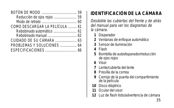 BOTÓN DE MODO 59 Reducción de ojos rojos 59 Modo de retrato 60 COMO DESCARGAR LA PELÍCULA 61 Rebobinado automático 61 Rebobinado manual 62 CUIDADO DE SU CÁMARA 63 PROBLEMAS Y SOLUCIONES 64 ESPECIFICACIONES 66