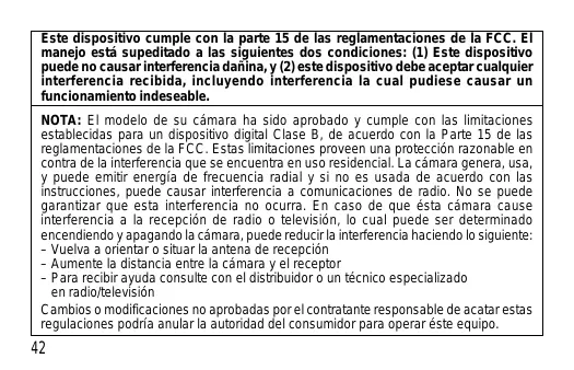 NOTA: El modelo de su câmara ha sido aprobado y cumple con las limitaciones establecidas para un disposito digital Clase 8, de acuerdo con la Parte 15 de las reglamentaciones de la FCC. Estas Imitaciones proveen una protecciôn razonable en contra de la interferencia que se encuentra en uso residencial. La camara genera, usa, y puede emiir energia de frecuencia radial y si no es usada de acuerdo con las instrucciones, puede causar interferencia à comunicaciones de radio. No se puede garantizar que esta interferencia no ocurra. En caso de que ésta cmara cause interferencia a la recepciôn de radio 0 televisién, lo cual puede ser determinado encendiendo y apagando la cémare, puede reducirla interferencia haciendo lo siguiente: - Vuelva 2 orientar o situer là antena de recepciôn - Aumente la distancia entre là cémara y el receptor - Para recibir ayuda consult con el distrbuidor 6 un técnico especializado