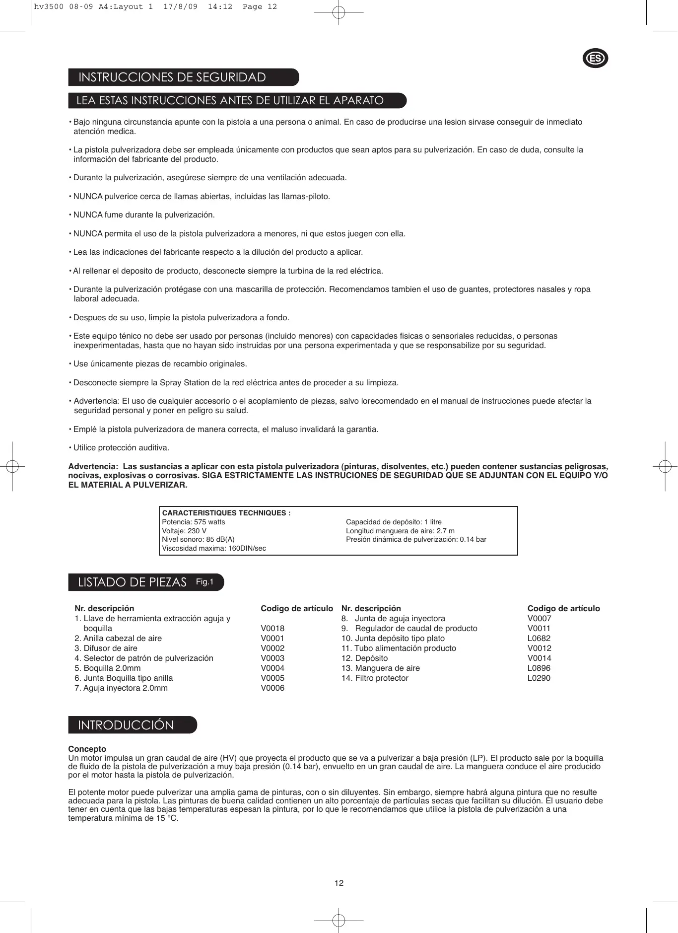 V0006 Codigo de artículo V0007 V0011 L0682 V0012 V0014 L0896 L0290 INTRODUCCIÓN Concepto Un motor impulsa un gran caudal de aire (HV) que proyecta el producto que se va a pulverizar a baja presión (LP). El producto sale por la boquilla de fluido de la pistola de pulverización a muy baja presión (0.14 bar), envuelto en un gran caudal de aire. La manguera conduce el aire producido por el motor hasta la pistola de pulverización. El potente motor puede pulverizar una amplia gama de pinturas, con o sin diluyentes. Sin embargo, siempre habrá alguna pintura que no resulte adecuada para la pistola. Las pinturas de buena calidad contienen un alto porcentaje de partículas secas que facilitan su dilución. El usuario debe tener en cuenta que las bajas temperaturas espesan la pintura, por lo que le recomendamos que utilice la pistola de pulverización a una temperatura mínima de 15 ºC.