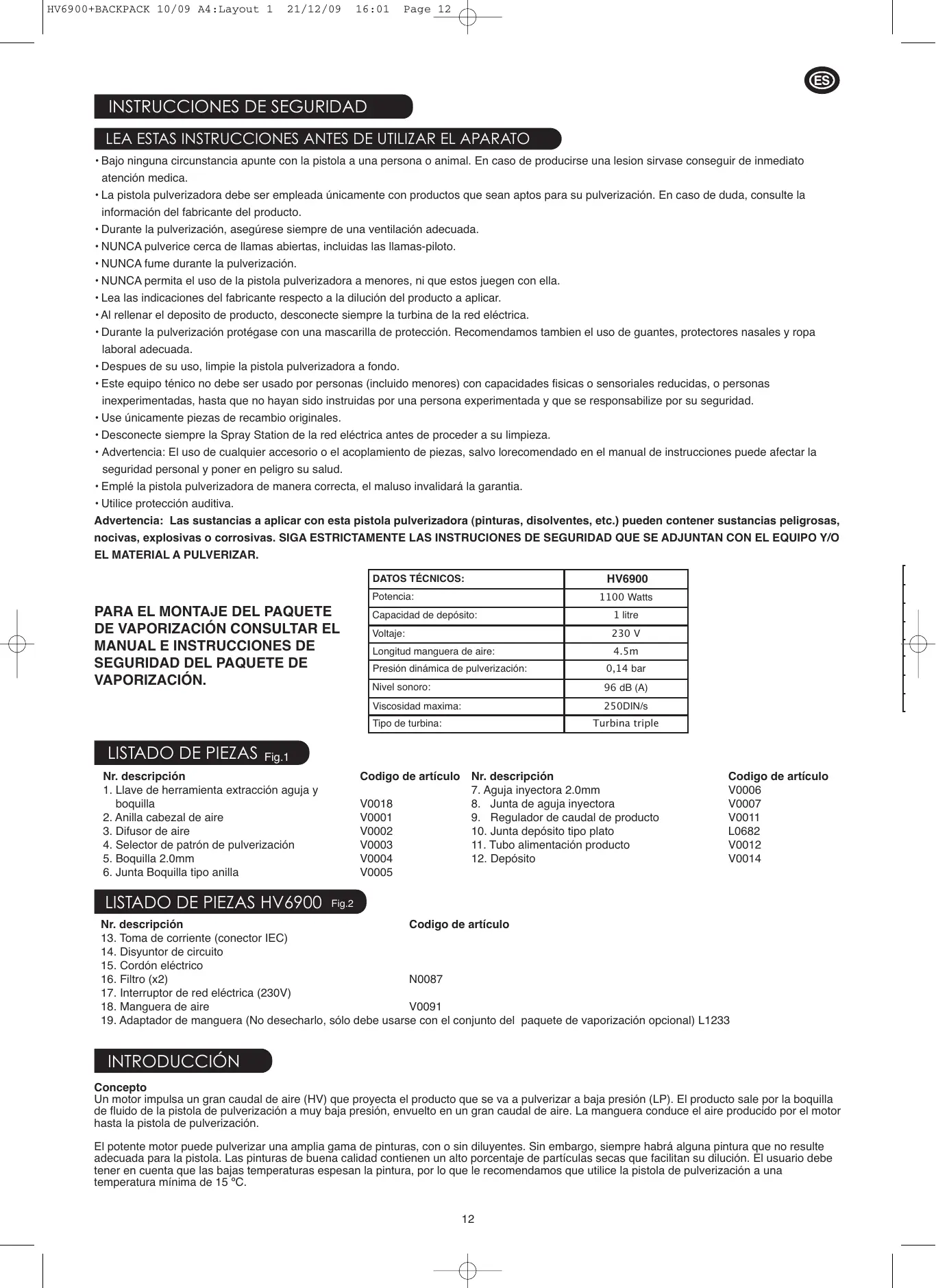 INTRODUCCIÓN Concepto Un motor impulsa un gran caudal de aire (HV) que proyecta el producto que se va a pulverizar a baja presión (LP). El producto sale por la boquilla de fluido de la pistola de pulverización a muy baja presión, envuelto en un gran caudal de aire. La manguera conduce el aire producido por el motor hasta la pistola de pulverización. El potente motor puede pulverizar una amplia gama de pinturas, con o sin diluyentes. Sin embargo, siempre habrá alguna pintura que no resulte adecuada para la pistola. Las pinturas de buena calidad contienen un alto porcentaje de partículas secas que facilitan su dilución. El usuario debe tener en cuenta que las bajas temperaturas espesan la pintura, por lo que le recomendamos que utilice la pistola de pulverización a una temperatura mínima de 15 ºC.