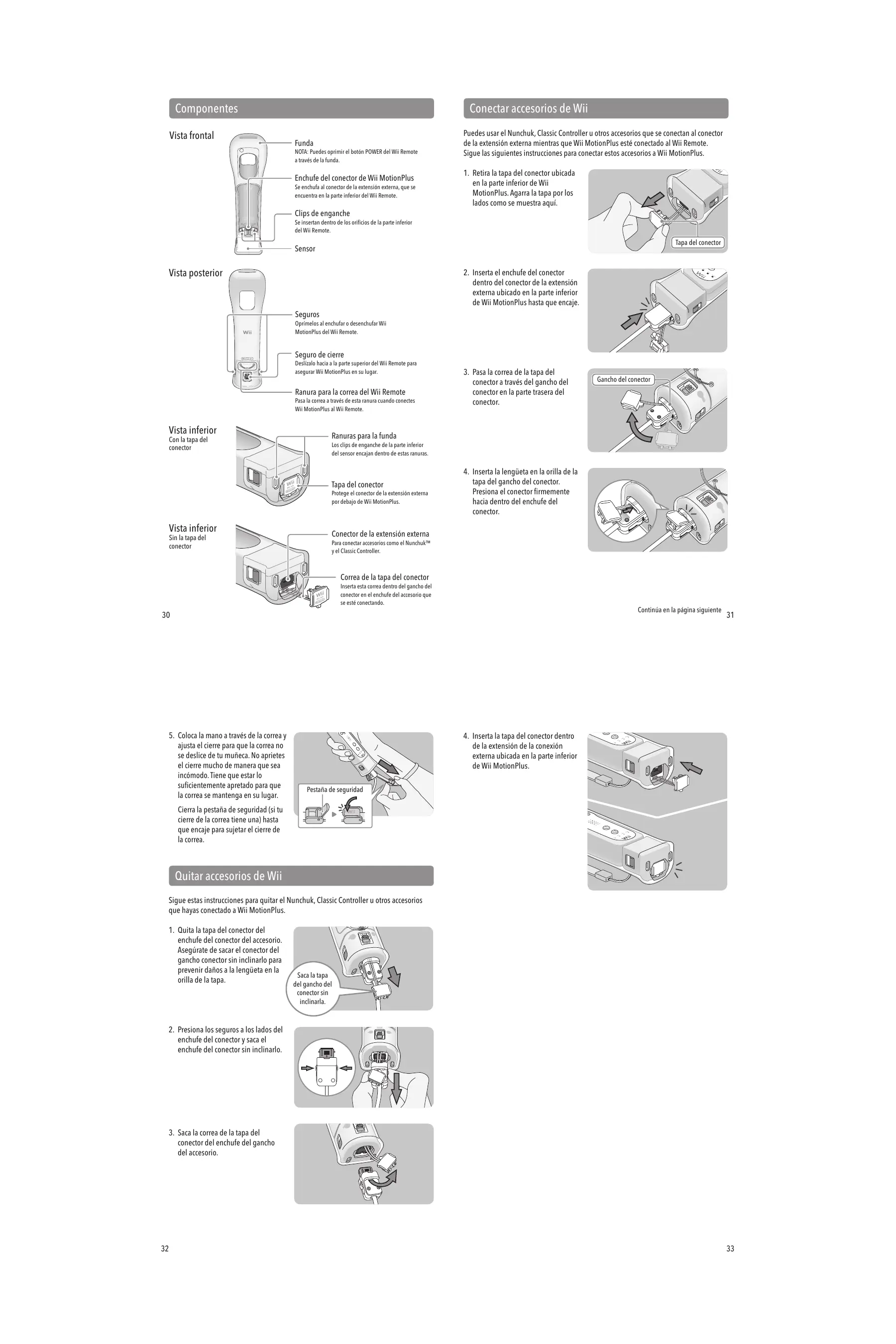 Componentes . . . . . . . . . . . . . . . . . . . . . . . . . . . . . . . . . . . . . . . . . . . . . . . . . . 30 Conectar accesorios de Wii . . . . . . . . . . . . . . . . . . . . . . . . . . . . . . . . . . . . . . 31 Quitar accesorios de Wii . . . . . . . . . . . . . . . . . . . . . . . . . . . . . . . . . . . . . . . . . 32