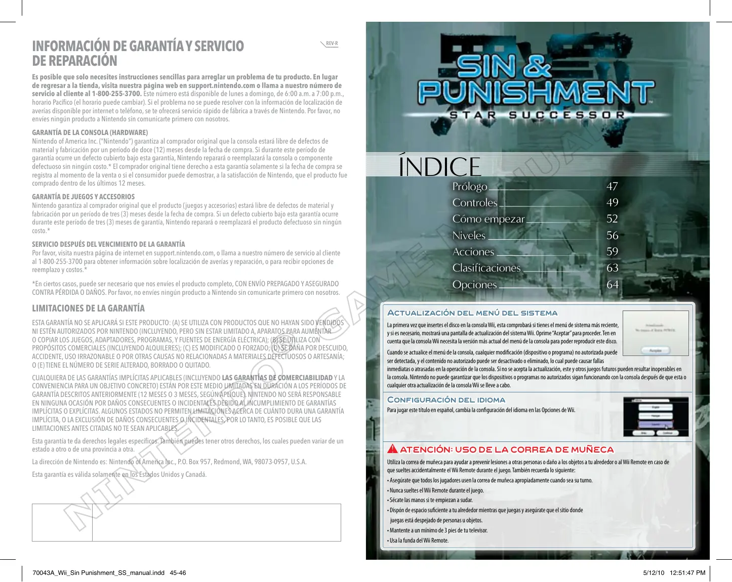 5/12/10 12:51:45 PM INFORMACIÓN DE GARANTÍA Y SERVICIO DE REPARACIÓN REV-R Es posible que solo necesites instrucciones sencillas para arreglar un problema de tu producto. En lugar de regresar a la tienda, visita nuestra página web en support.nintendo.com o llama a nuestro número de servicio al cliente al 1-800-255-3700. Este número está disponible de lunes a domingo, de 6:00 a.m. a 7:00 p.m., horario Pacífico (el horario puede cambiar). Si el problema no se puede resolver con la información de localización de averías disponible por internet o teléfono, se te ofrecerá servicio rápido de fábrica a través de Nintendo. Por favor, no envíes ningún producto a Nintendo sin comunicarte primero con nosotros. GARANTÍA DE LA CONSOLA (HARDWARE) Nintendo of America Inc. (“Nintendo”) garantiza al comprador original que la consola estará libre de defectos de material y fabricación por un período de doce (12) meses desde la fecha de compra. Si durante este período de garantía ocurre un defecto cubierto bajo esta garantía, Nintendo reparará o reemplazará la consola o componente defectuoso sin ningún costo.* El comprador original tiene derecho a esta garantía solamente si la fecha de compra se registra al momento de la venta o si el consumidor puede demostrar, a la satisfacción de Nintendo, que el producto fue comprado dentro de los últimos 12 meses. GARANTÍA DE JUEGOS Y ACCESORIOS Nintendo garantiza al comprador original que el producto (juegos y accesorios) estará libre de defectos de material y fabricación por un período de tres (3) meses desde la fecha de compra. Si un defecto cubierto bajo esta garantía ocurre durante este período de tres (3) meses de garantía, Nintendo reparará o reemplazará el producto defectuoso sin ningún costo.* SERVICIO DESPUÉS DEL VENCIMIENTO DE LA GARANTÍA Por favor, visita nuestra página de internet en support.nintendo.com, o llama a nuestro número de servicio al cliente al 1-800-255-3700 para obtener información sobre localización de averías y reparación, o para recibir opciones de reemplazo y costos.* *En ciertos casos, puede ser necesario que nos envíes el producto completo, CON ENVÍO PREPAGADO Y ASEGURADO CONTRA PÉRDIDA O DAÑOS. Por favor, no envíes ningún producto a Nintendo sin comunicarte primero con nosotros.