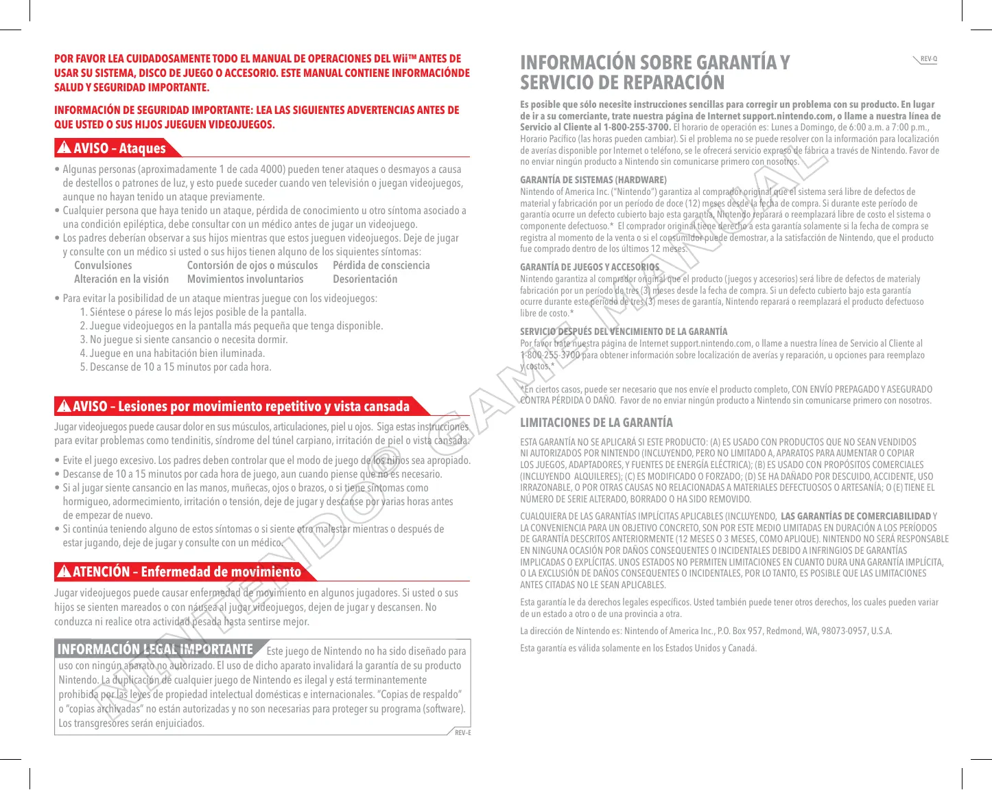 REV-Q Es posible que sólo necesite instrucciones sencillas para corregir un problema con su producto. En lugar de ir a su comerciante, trate nuestra página de Internet support.nintendo.com, o llame a nuestra línea de Servicio al Cliente al 1-800-255-3700. El horario de operación es: Lunes a Domingo, de 6:00 a.m. a 7:00 p.m., Horario Pacífico (las horas pueden cambiar). Si el problema no se puede resolver con la información para localización de averías disponible por Internet o teléfono, se le ofrecerá servicio expreso de fábrica a través de Nintendo. Favor de no enviar ningún producto a Nintendo sin comunicarse primero con nosotros. GARANTÍA DE SISTEMAS (HARDWARE) Nintendo of America Inc. (“Nintendo”) garantiza al comprador original que el sistema será libre de defectos de material y fabricación por un período de doce (12) meses desde la fecha de compra. Si durante este período de garantía ocurre un defecto cubierto bajo esta garantía, Nintendo reparará o reemplazará libre de costo el sistema o componente defectuoso.* El comprador original tiene derecho a esta garantía solamente si la fecha de compra se registra al momento de la venta o si el consumidor puede demostrar, a la satisfacción de Nintendo, que el producto fue comprado dentro de los últimos 12 meses.