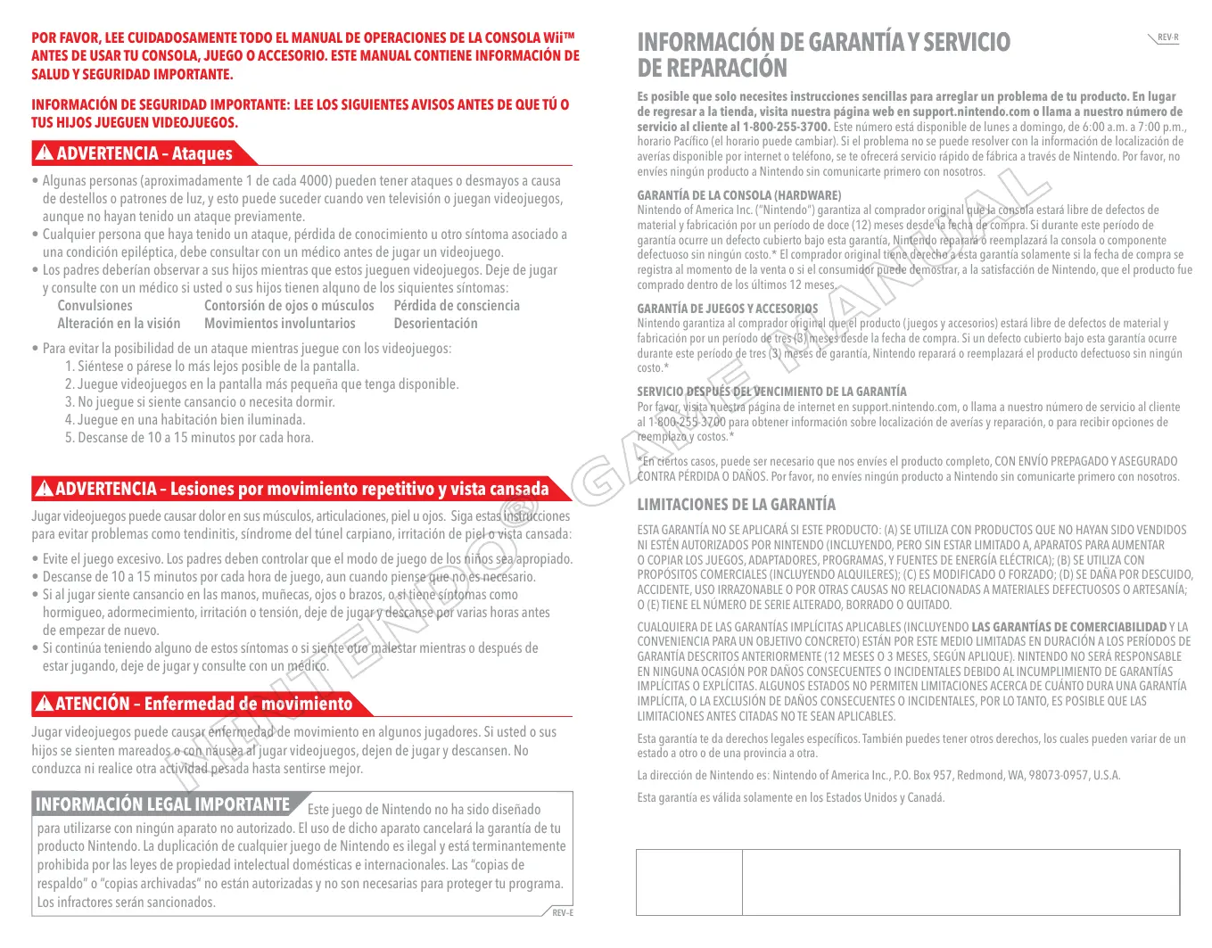 POR FAVOR, LEE CUIDADOSAMENTETodo EL MANUAL DE OPERaciones DE LA CONSOLA Wii™ ANTES DE USAR TU CONSOLA, JUEGO O ACCESORIO. ESTE MANUAL CONTIENE INFORMACION DE SALUD Y SEGURIDAD IMPORTANTE.