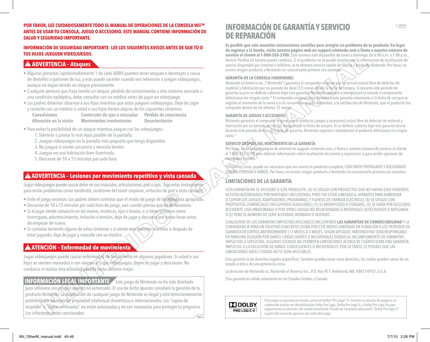 POR FAVOR, LEE CUIDADOSAMENTETodo EL MANUAL DE OPERaciones DE LA CONSOLA Wii™ ANTES DE USART TU CONSOLA, JUEGO O ACCESORIO. ESTE MANUAL CONTIENE INFORMACION DE SALUD Y SEGURIDAD IMPORTANTE.