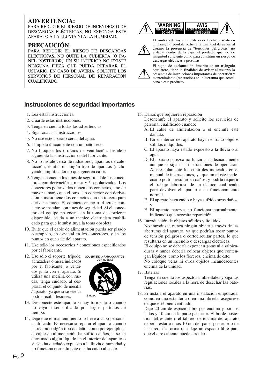Es-2 Lea estas instrucciones. Guarde estas instrucciones. Tenga en cuenta todas las advertencias. Siga todas las instrucciones. No use este aparato cerca del agua. Límpielo únicamente con un paño seco. No bloquee los orificios de ventilación. Instálelo siguiendo las instrucciones del fabricante. No lo instale cerca de radiadores, aparatos de calefacción, estufas ni ningún tipo de aparatos (incluyendo amplificadores) que generen calor. Tenga en cuenta los fines de seguridad de los conectores con derivación a masa y / o polarizados. Los conectores polarizados tienen dos contactos, uno de mayor tamaño que el otro. Un conector con derivación a masa tiene dos contactos con un tercero para derivar a masa. El contacto ancho o el tercer contacto se instalan con fines de seguridad. Si el conector del equipo no encaja en la toma de corriente disponible, acuda a un técnico electricista cualificado para que le substituya la toma obsoleta. Evite que el cable de alimentación pueda ser pisado o atrapado, en especial en los conectores, y en los puntos en que sale del aparato. Use sólo los accesorios / conexiones especificados por el fabricante. Use sólo el soporte, trípode, ADUERTENCIA PARA CARRITOS CON RUEDAS abrazadera o mesa indicados por el fabricante, o vendidos junto con el aparato. Si utiliza una mesilla con ruedas, tenga cuidado, al desplazar el conjunto de mesilla / aparato, ya que si se vuelca S3125A podría recibir lesiones. Desconecte este aparato si hay tormenta o cuando no vaya a ser utilizado por largos períodos de tiempo. Deje que el mantenimiento lo lleve a cabo personal cualificado. Es necesario reparar el aparato cuando ha recibido algún tipo de daño, como por ejemplo si el cable de alimentación ha sufrido daños, si se ha derramado algún líquido en el interior del aparato o si éste ha quedado expuesto a la lluvia o humedad y no funciona normalmente o si ha caído al suelo.