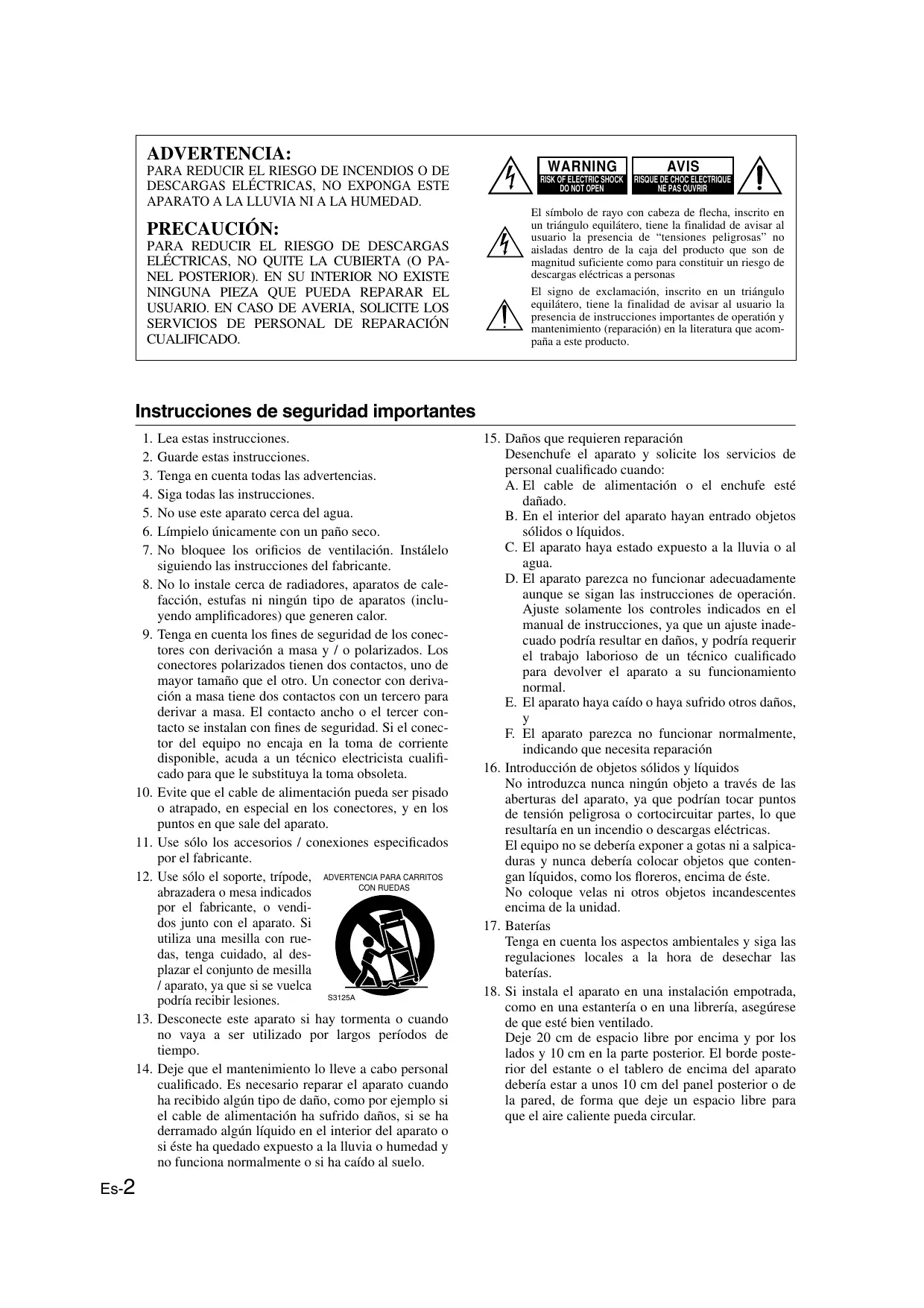 Guarde estas instrucciones. Tenga en cuenta todas las advertencias. Siga todas las instrucciones. No use este aparato cerca del agua. Límpielo únicamente con un paño seco. No bloquee los orificios de ventilación. Instálelo siguiendo las instrucciones del fabricante. No lo instale cerca de radiadores, aparatos de calefacción, estufas ni ningún tipo de aparatos (incluyendo amplificadores) que generen calor. Tenga en cuenta los fines de seguridad de los conectores con derivación a masa y / o polarizados. Los conectores polarizados tienen dos contactos, uno de mayor tamaño que el otro. Un conector con derivación a masa tiene dos contactos con un tercero para derivar a masa. El contacto ancho o el tercer contacto se instalan con fines de seguridad. Si el conector del equipo no encaja en la toma de corriente disponible, acuda a un técnico electricista cualificado para que le substituya la toma obsoleta. Evite que el cable de alimentación pueda ser pisado o atrapado, en especial en los conectores, y en los puntos en que sale del aparato. Use sólo los accesorios / conexiones especificados por el fabricante. Use sólo el soporte, trípode, ADVERTENCIA PARA CARRITOS CON RUEDAS abrazadera o mesa indicados por el fabricante, o vendidos junto con el aparato. Si utiliza una mesilla con ruedas, tenga cuidado, al desplazar el conjunto de mesilla / aparato, ya que si se vuelca S3125A podría recibir lesiones. Desconecte este aparato si hay tormenta o cuando no vaya a ser utilizado por largos períodos de tiempo. Deje que el mantenimiento lo lleve a cabo personal cualificado. Es necesario reparar el aparato cuando ha recibido algún tipo de daño, como por ejemplo si el cable de alimentación ha sufrido daños, si se ha derramado algún líquido en el interior del aparato o si éste ha quedado expuesto a la lluvia o humedad y no funciona normalmente o si ha caído al suelo.