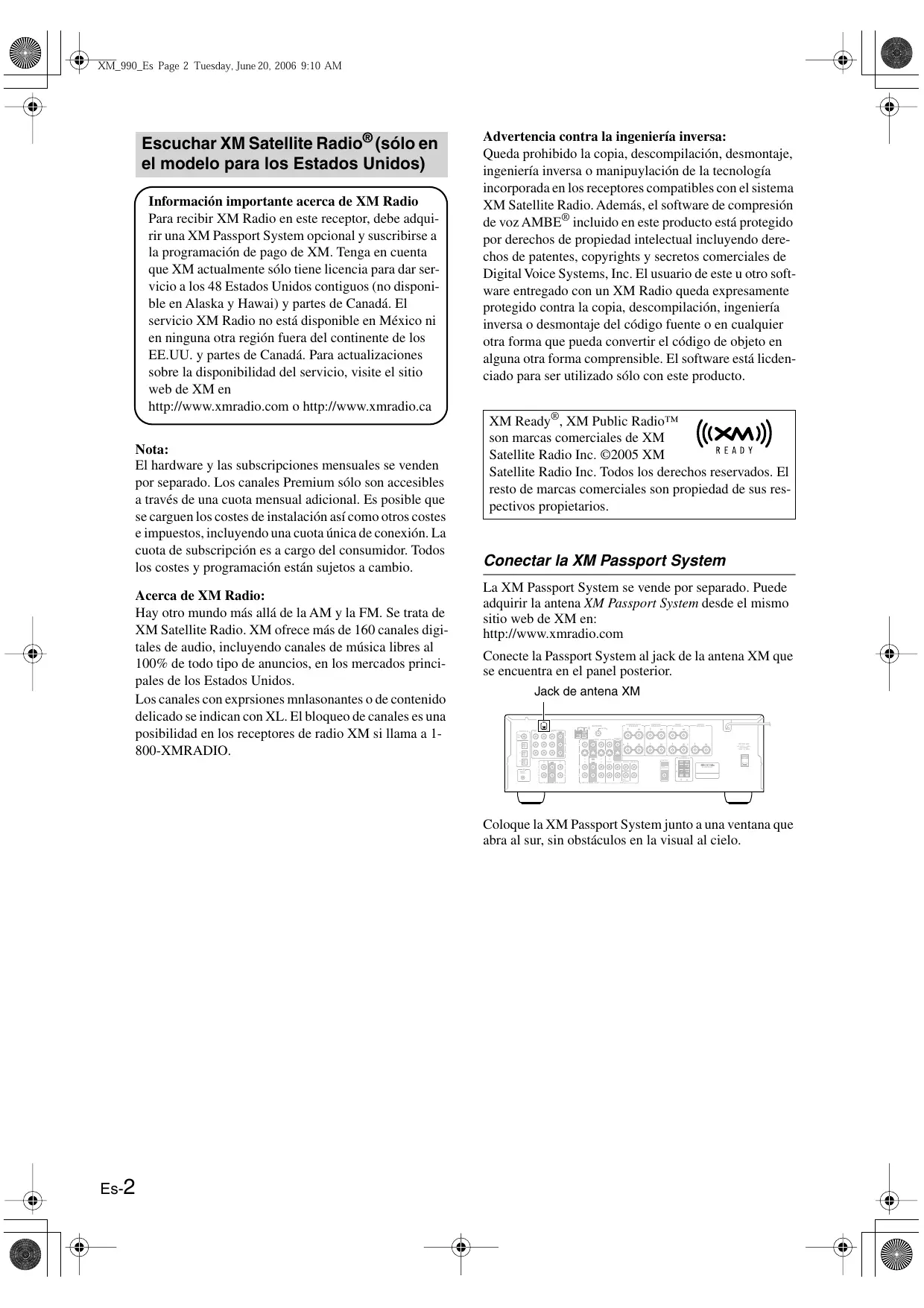 Queda prohibido la copia, descompilación, desmontaje, ingeniería inversa o manipuylación de la tecnología incorporada en los receptores compatibles con el sistema XM Satellite Radio. Además, el software de compresión de voz AMBE® incluido en este producto está protegido por derechos de propiedad intelectual incluyendo derechos de patentes, copyrights y secretos comerciales de Digital Voice Systems, Inc. El usuario de este u otro software entregado con un XM Radio queda expresamente protegido contra la copia, descompilación, ingeniería inversa o desmontaje del código fuente o en cualquier otra forma que pueda convertir el código de objeto en alguna otra forma comprensible. El software está licdenciado para ser utilizado sólo con este producto. XM Ready®, XM Public Radio™ son marcas comerciales de XM Satellite Radio Inc. ©2005 XM Satellite Radio Inc. Todos los derechos reservados. El resto de marcas comerciales son propiedad de sus respectivos propietarios.