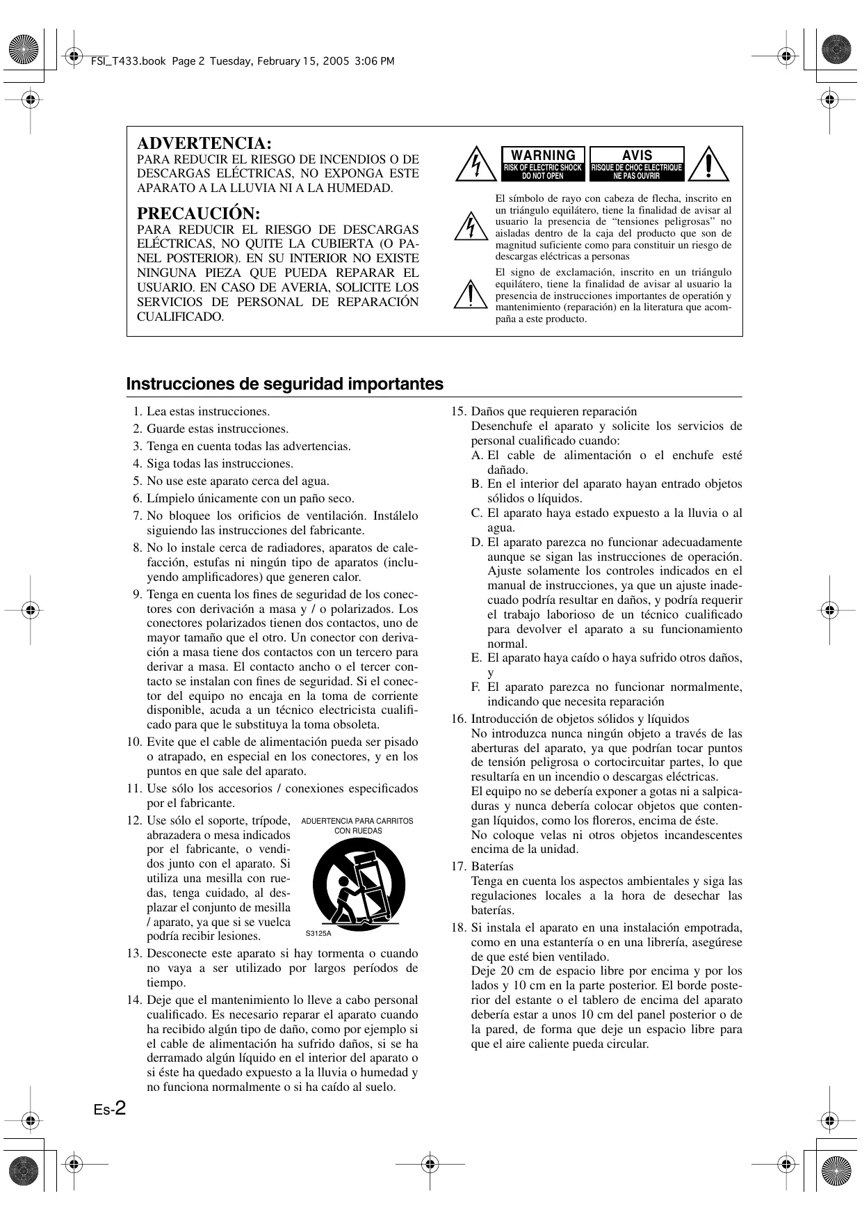 Guarde estas instrucciones. Tenga en cuenta todas las advertencias. Siga todas las instrucciones. No use este aparato cerca del agua. Límpielo únicamente con un paño seco. No bloquee los orificios de ventilación. Instálelo siguiendo las instrucciones del fabricante. No lo instale cerca de radiadores, aparatos de calefacción, estufas ni ningún tipo de aparatos (incluyendo amplificadores) que generen calor. Tenga en cuenta los fines de seguridad de los conectores con derivación a masa y / o polarizados. Los conectores polarizados tienen dos contactos, uno de mayor tamaño que el otro. Un conector con derivación a masa tiene dos contactos con un tercero para derivar a masa. El contacto ancho o el tercer contacto se instalan con fines de seguridad. Si el conector del equipo no encaja en la toma de corriente disponible, acuda a un técnico electricista cualificado para que le substituya la toma obsoleta. Evite que el cable de alimentación pueda ser pisado o atrapado, en especial en los conectores, y en los puntos en que sale del aparato. Use sólo los accesorios / conexiones especificados por el fabricante. Use sólo el soporte, trípode, ADUERTENCIA PARA CARRITOS CON RUEDAS abrazadera o mesa indicados por el fabricante, o vendidos junto con el aparato. Si utiliza una mesilla con ruedas, tenga cuidado, al desplazar el conjunto de mesilla / aparato, ya que si se vuelca S3125A podría recibir lesiones. Desconecte este aparato si hay tormenta o cuando no vaya a ser utilizado por largos períodos de tiempo. Deje que el mantenimiento lo lleve a cabo personal cualificado. Es necesario reparar el aparato cuando ha recibido algún tipo de daño, como por ejemplo si el cable de alimentación ha sufrido daños, si se ha derramado algún líquido en el interior del aparato o si éste ha quedado expuesto a la lluvia o humedad y no funciona normalmente o si ha caído al suelo.