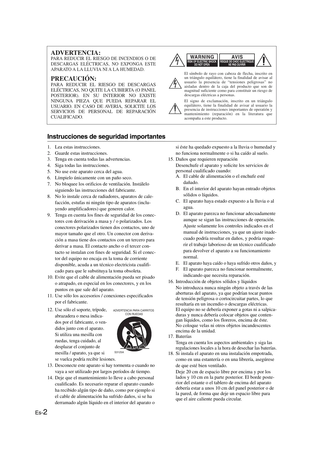 Si utiliza una mesilla con ruedas, tenga cuidado, al desplazar el conjunto de S3125A mesilla / aparato, ya que si se vuelca podría recibir lesiones. 13. Desconecte este aparato si hay tormenta o cuando no vaya a ser utilizado por largos períodos de tiempo. 14. Deje que el mantenimiento lo lleve a cabo personal cualificado. Es necesario reparar el aparato cuando ha recibido algún tipo de daño, como por ejemplo si el cable de alimentación ha sufrido daños, si se ha derramado algún líquido en el interior del aparato o