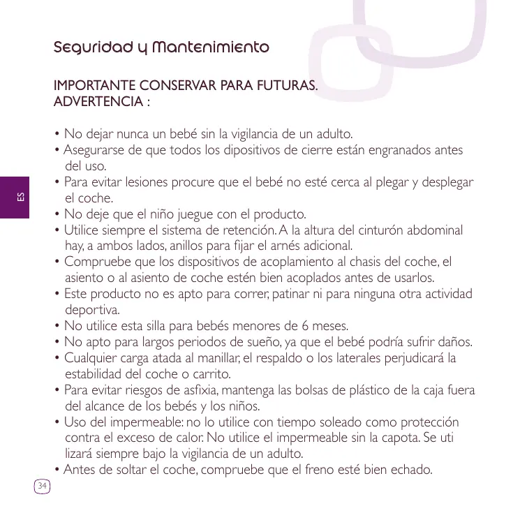 • Asegurarse de que todos los dipositivos de cierre están engranados antes del uso. • Para evitar lesiones procure que el bebé no esté cerca al plegar y desplegar el coche. • No deje que el niño juegue con el producto. • Utilice siempre el sistema de retención. A la altura del cinturón abdominal hay, a ambos lados, anillos para fijar el arnés adicional. • Compruebe que los dispositivos de acoplamiento al chasis del coche, el asiento o al asiento de coche estén bien acoplados antes de usarlos. • Este producto no es apto para correr, patinar ni para ninguna otra actividad deportiva. • No utilice esta silla para bebés menores de 6 meses. • No apto para largos periodos de sueño, ya que el bebé podría sufrir daños. • Cualquier carga atada al manillar, el respaldo o los laterales perjudicará la estabilidad del coche o carrito. • Para evitar riesgos de asfixia, mantenga las bolsas de plástico de la caja fuera del alcance de los bebés y los niños. • Uso del impermeable: no lo utilice con tiempo soleado como protección contra el exceso de calor. No utilice el impermeable sin la capota. Se uti lizará siempre bajo la vigilancia de un adulto. • Antes de soltar el coche, compruebe que el freno esté bien echado. 34