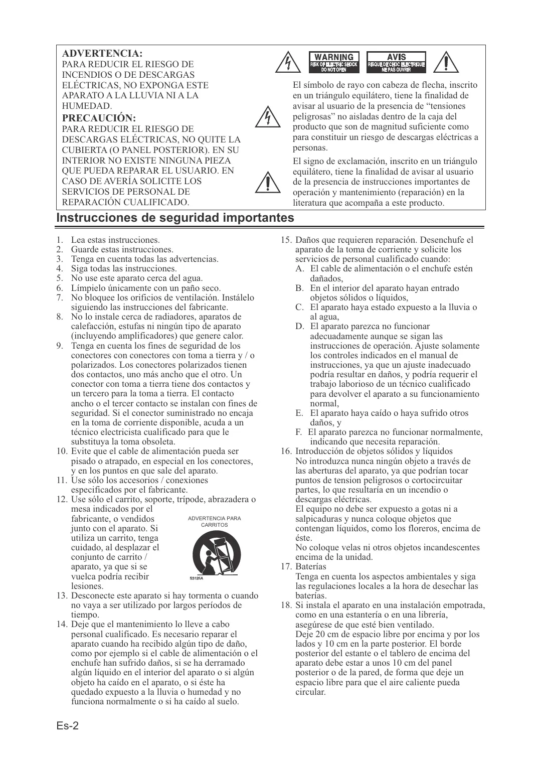Lea estas instrucciones. Guarde estas instrucciones. Tenga en cuenta todas las advertencias. Siga todas las instrucciones. No use este aparato cerca del agua. Límpielo únicamente con un paño seco. No bloquee los orificios de ventilación. Instálelo siguiendo las instrucciones del fabricante. No lo instale cerca de radiadores, aparatos de calefacción, estufas ni ningún tipo de aparato (incluyendo amplificadores) que genere calor. Tenga en cuenta los fines de seguridad de los conectores con conectores con toma a tierra y / o polarizados. Los conectores polarizados tienen dos contactos, uno más ancho que el otro. Un conector con toma a tierra tiene dos contactos y un tercero para la toma a tierra. El contacto ancho o el tercer contacto se instalan con fines de seguridad. Si el conector suministrado no encaja en la toma de corriente disponible, acuda a un técnico electricista cualificado para que le substituya la toma obsoleta. Evite que el cable de alimentación pueda ser pisado o atrapado, en especial en los conectores, y en los puntos en que sale del aparato. Use sólo los accesorios / conexiones especificados por el fabricante. Use sólo el carrito, soporte, trípode, abrazadera o mesa indicados por el ADVERTENCIA PARA fabricante, o vendidos CARRITOS junto con el aparato. Si utiliza un carrito, tenga cuidado, al desplazar el conjunto de carrito / aparato, ya que si se vuelca podría recibir lesiones. Desconecte este aparato si hay tormenta o cuando no vaya a ser utilizado por largos períodos de tiempo. Deje que el mantenimiento lo lleve a cabo personal cualificado. Es necesario reparar el aparato cuando ha recibido algún tipo de daño, como por ejemplo si el cable de alimentación o el enchufe han sufrido daños, si se ha derramado algún líquido en el interior del aparato o si algún objeto ha caído en el aparato, o si éste ha quedado expuesto a la lluvia o humedad y no funciona normalmente o si ha caído al suelo. Es-2