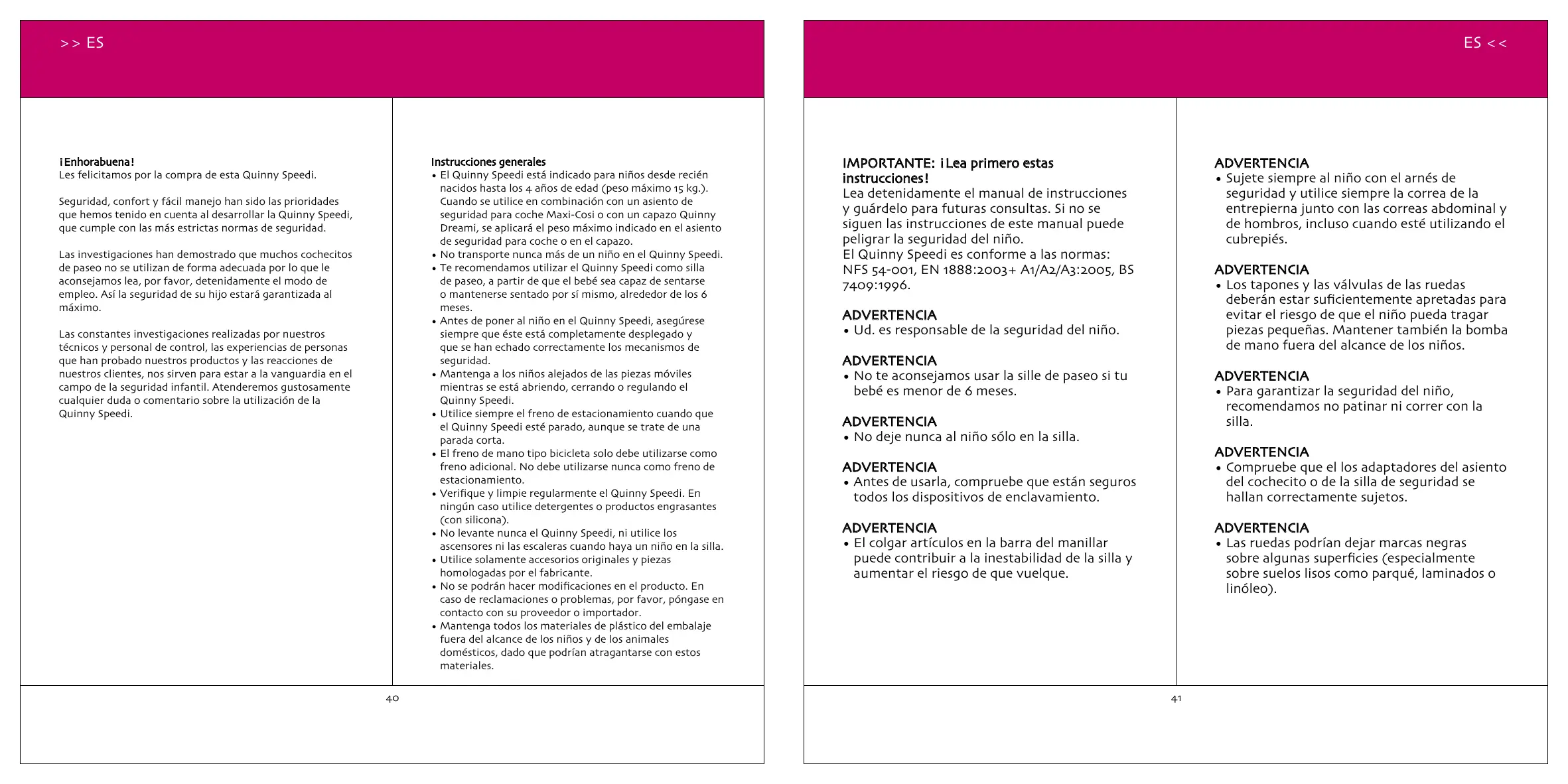 Lea detenidamente el manual de instrucciones y guárdelo para futuras consultas. Si no se siguen las instrucciones de este manual puede peligrar la seguridad del niño. El Quinny Speedi es conforme a las normas: NFS 54-001, EN 1888:2003+ A1/A2/A3:2005, BS 7409:1996.