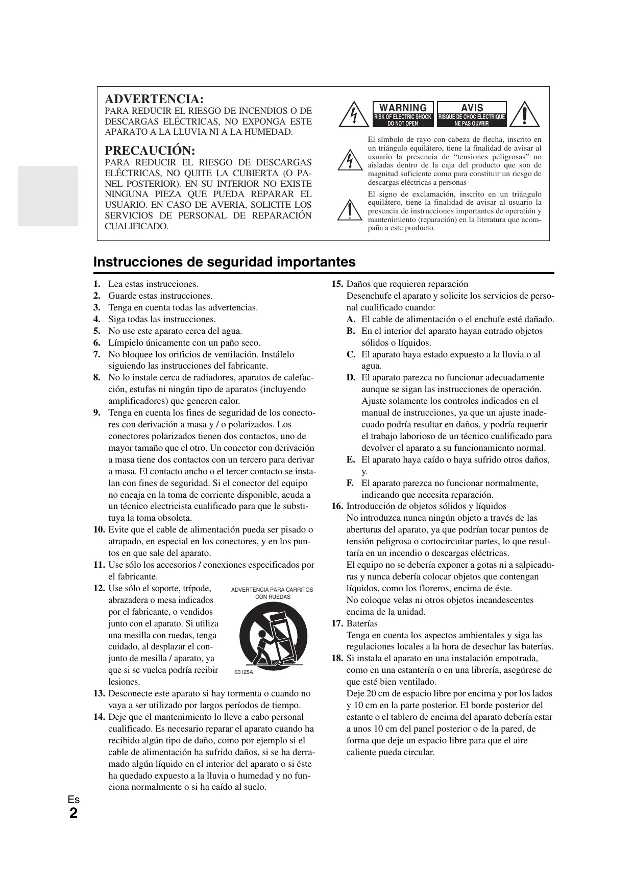 Guarde estas instrucciones. Tenga en cuenta todas las advertencias. Siga todas las instrucciones. No use este aparato cerca del agua. Límpielo únicamente con un paño seco. No bloquee los orificios de ventilación. Instálelo siguiendo las instrucciones del fabricante. No lo instale cerca de radiadores, aparatos de calefacción, estufas ni ningún tipo de aparatos (incluyendo amplificadores) que generen calor. Tenga en cuenta los fines de seguridad de los conectores con derivación a masa y / o polarizados. Los conectores polarizados tienen dos contactos, uno de mayor tamaño que el otro. Un conector con derivación a masa tiene dos contactos con un tercero para derivar a masa. El contacto ancho o el tercer contacto se instalan con fines de seguridad. Si el conector del equipo no encaja en la toma de corriente disponible, acuda a un técnico electricista cualificado para que le substituya la toma obsoleta. Evite que el cable de alimentación pueda ser pisado o atrapado, en especial en los conectores, y en los puntos en que sale del aparato. Use sólo los accesorios / conexiones especificados por el fabricante. Use sólo el soporte, trípode, ADVERTENCIA PARA CARRITOS CON RUEDAS abrazadera o mesa indicados por el fabricante, o vendidos junto con el aparato. Si utiliza una mesilla con ruedas, tenga cuidado, al desplazar el conjunto de mesilla / aparato, ya que si se vuelca podría recibir S3125A lesiones. Desconecte este aparato si hay tormenta o cuando no vaya a ser utilizado por largos períodos de tiempo. Deje que el mantenimiento lo lleve a cabo personal cualificado. Es necesario reparar el aparato cuando ha recibido algún tipo de daño, como por ejemplo si el cable de alimentación ha sufrido daños, si se ha derramado algún líquido en el interior del aparato o si éste ha quedado expuesto a la lluvia o humedad y no funciona normalmente o si ha caído al suelo.