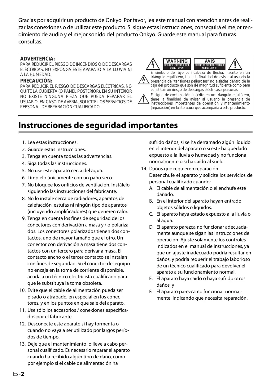 Gracias por adquirir un producto de Onkyo. Por favor, lea este manual con atención antes de realizar las conexiones o de utilizar este producto. Si sigue estas instrucciones, conseguirá el mejor rendimiento de audio y el mejor sonido del producto Onkyo. Guarde este manual para futuras consultas. ADVERTENCIA: PARA REDUCIR EL RIESGO DE INCENDIOS O DE DESCARGAS ELÉCTRICAS, NO EXPONGA ESTE APARATO A LA LLUVIA NI A LA HUMEDAD.