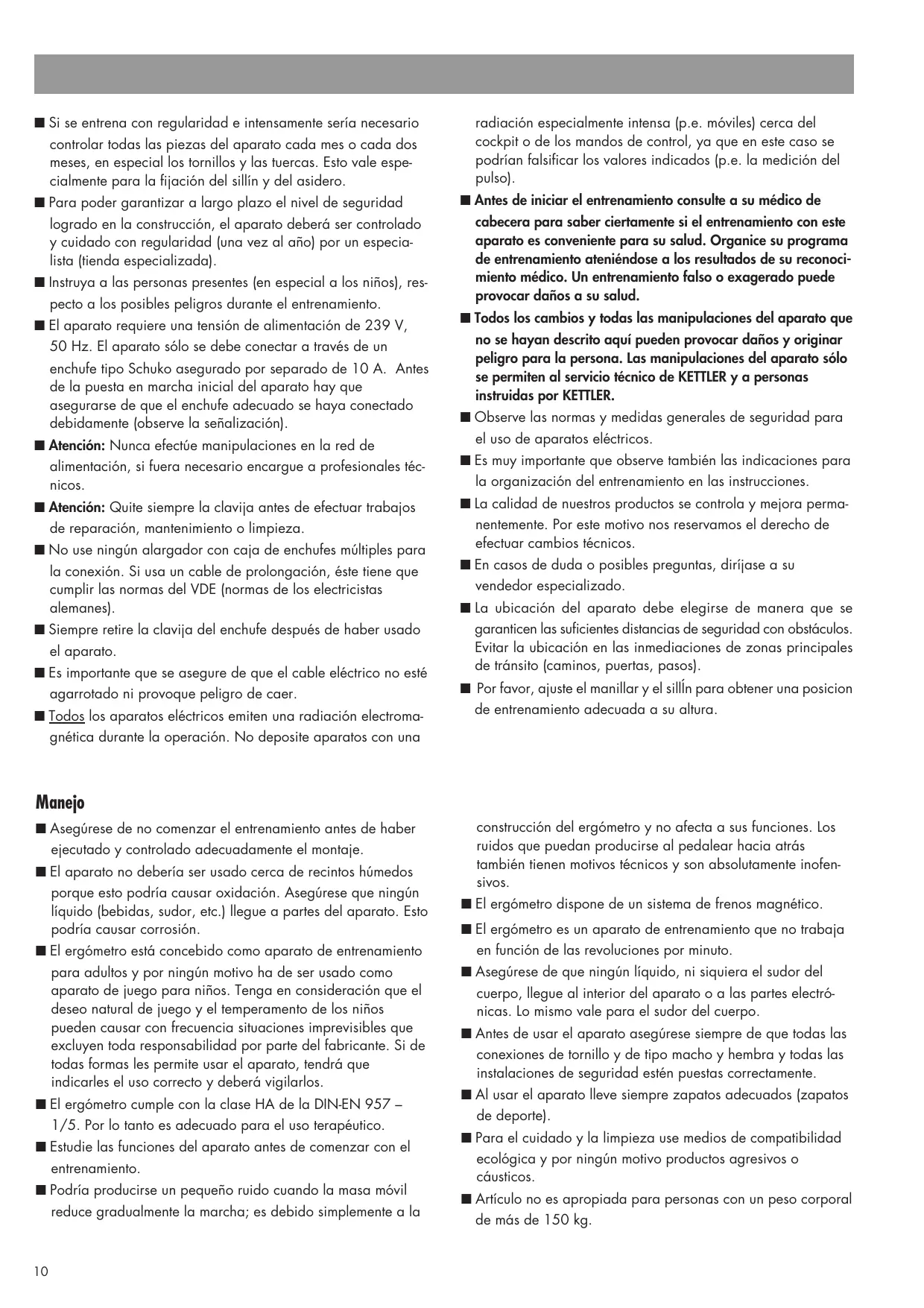 Para su seguridad ■ El ergómetro sólo debe ser usado para la aplicación prevista, es decir para el entrenamiento corporal de personas mayores. ■ Cualquier otro uso está prohibido y podrá ser peligroso. El fabricante no responde por daños debidos al uso inadecuado del aparato. ■ Usted entrena con un aparato que ha sido fabricado según los últimos avances tecnológicos en cuanto a seguridad. Han sido evitados y asegurados de la mejor forma posible todos los puntos peligrosos que podrían causar lesiones.